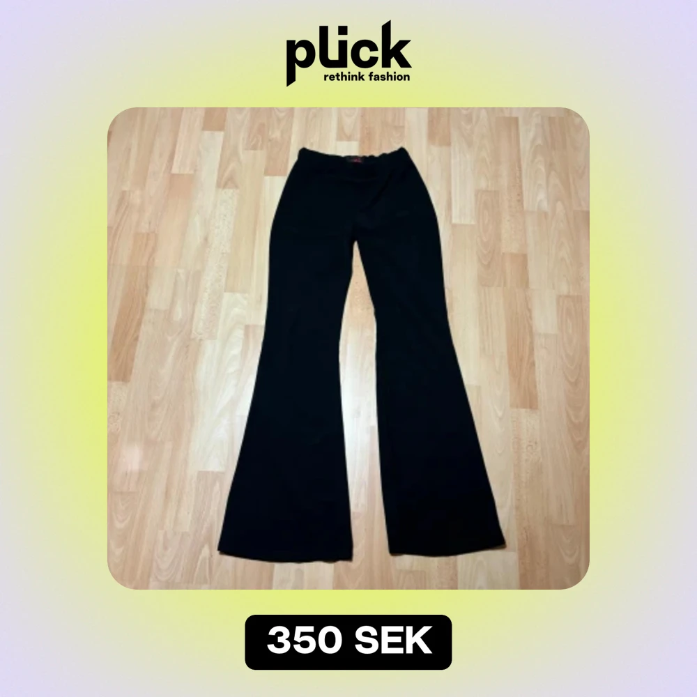 Svarta vintage utsvängda byxor, perfekt skick. Midjan är 36,5 cm men har mycket stretch och kan gå upp till 42 cm, passar många! Innerbenslängden är 83 cm.