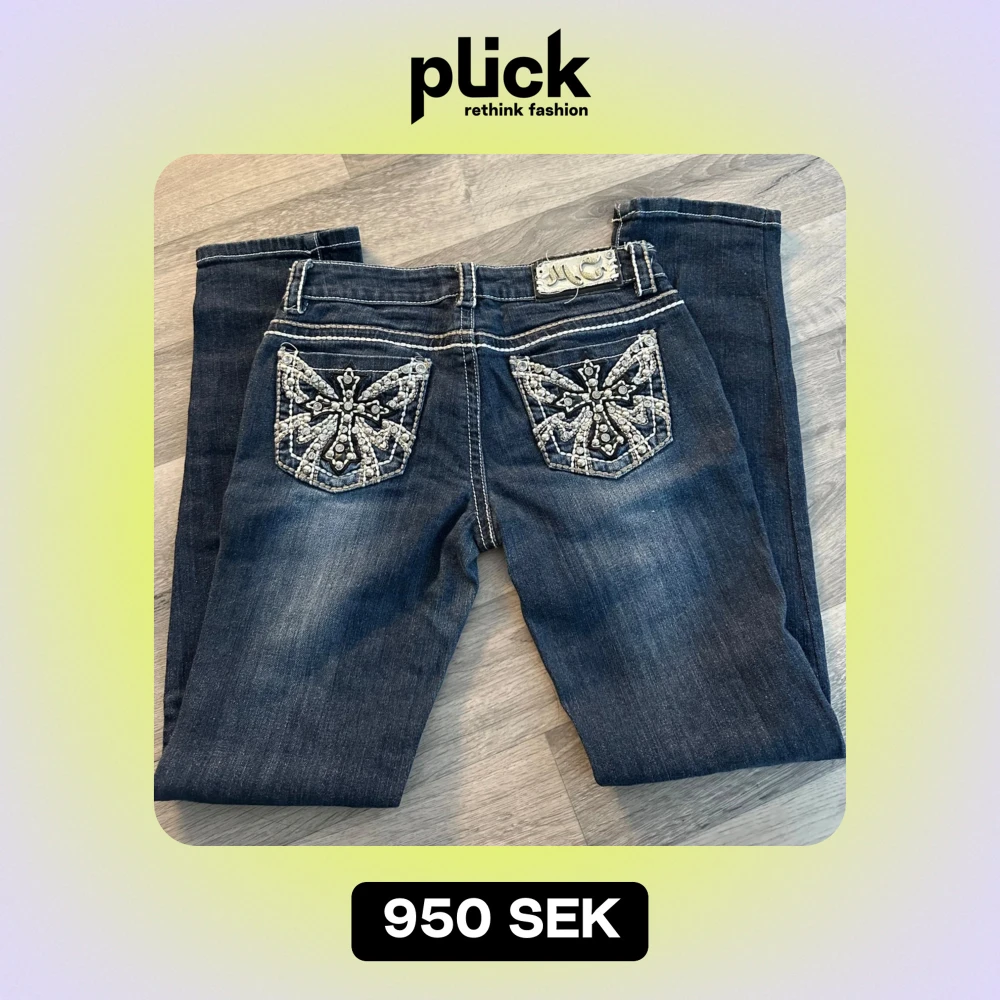 Snygga mörkblå jeans från Miss Chic med unika broderade detaljer på bakfickorna. Jeansen har en klassisk femficksdesign och en med dragkedja . Längden är ungefär 106cm. Perfekta för dig som vill ha något extra i garderoben! Och det är vintage kom med bud 🥳 säljer den för att den var för lång för mig som är 152 hade säkert passat dig perfekt som är 160-170 skulle jag gissa 😅