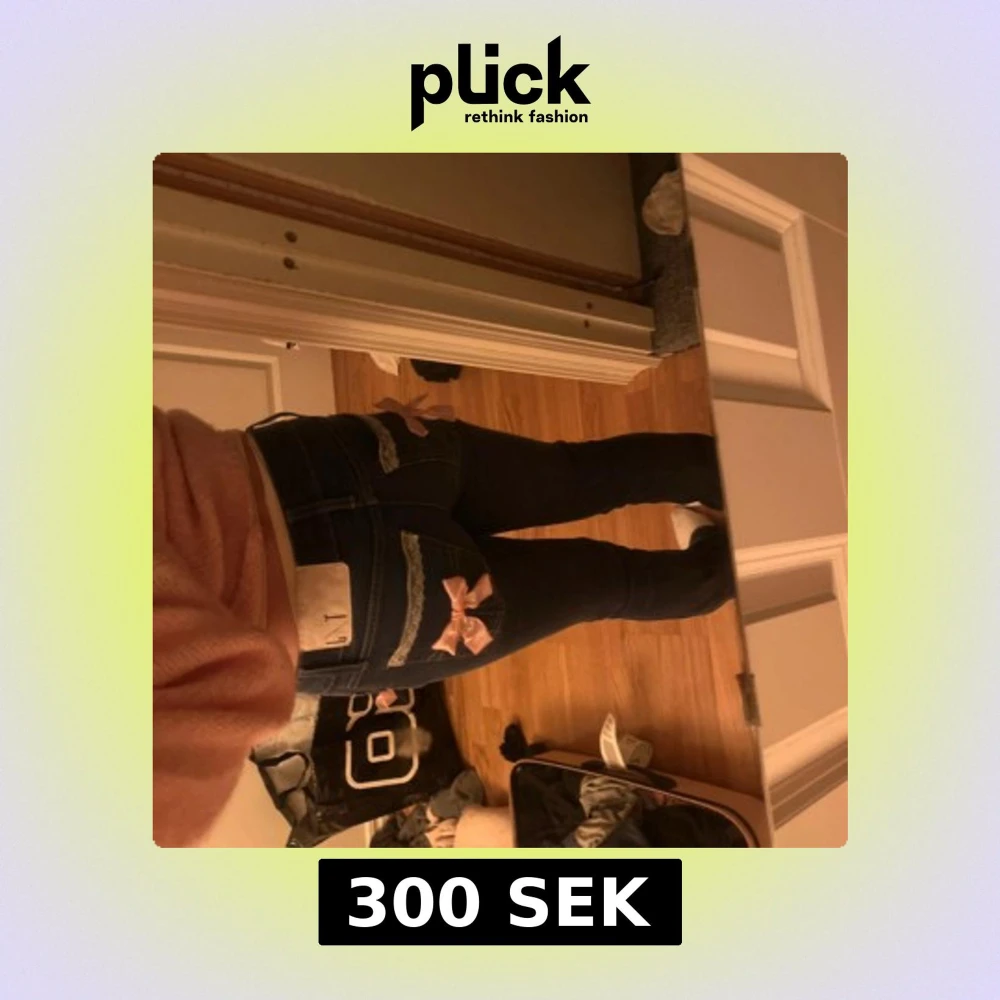 Snygga blå jeans med unika rosa rosetter på bakfickorna. Jeansen har jag själv sytt om från skinny till bootcut. Har även sytt på detaljerna. Perfekta för att ge din outfit en söt och lekfull touch.