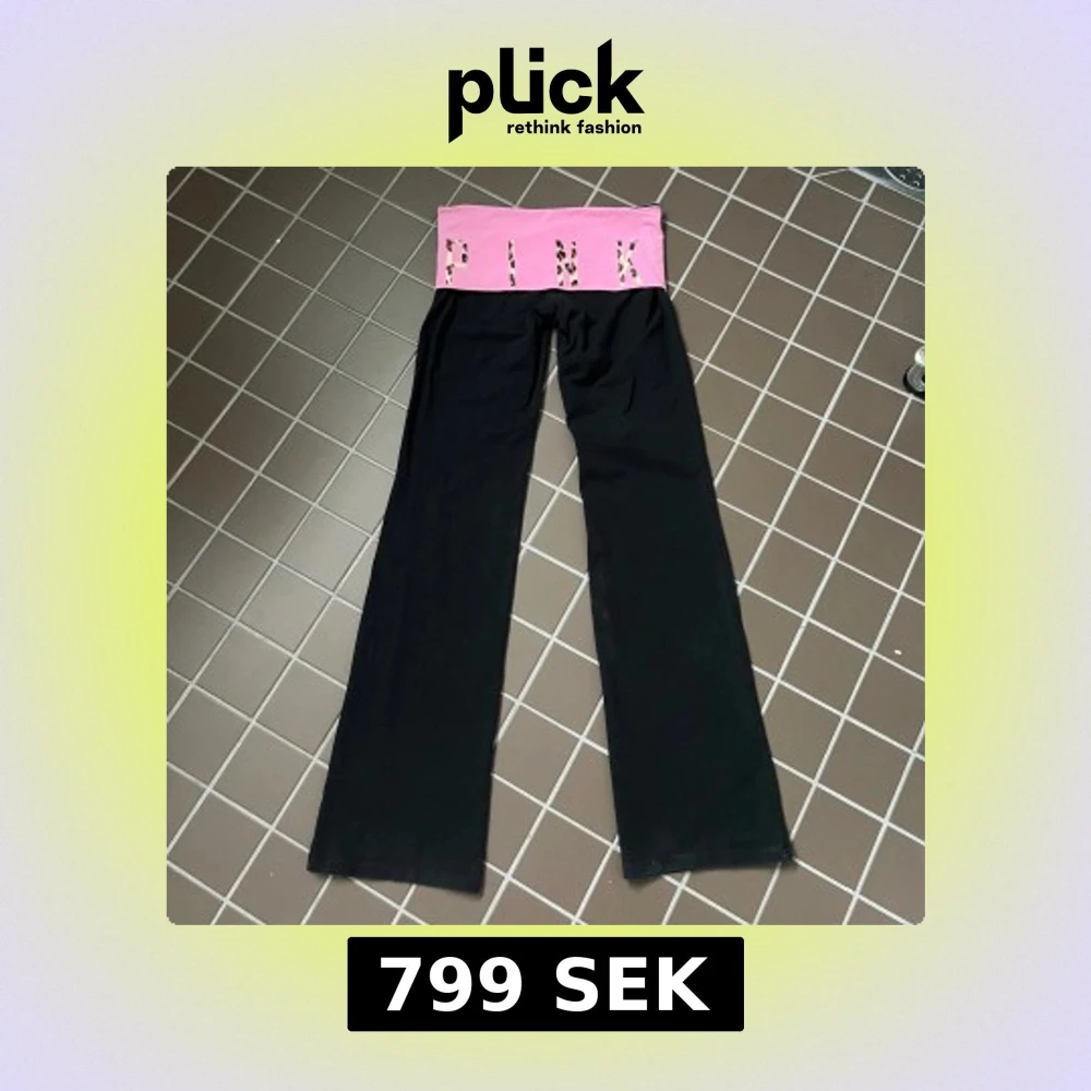 Svarta yoga pants från Victoria's Secret Pink med utsvängda ben och låg midja, storlek s enligt lapp. Innerbenslängd är 84 cm och midja rakt över är 37 cm. De har blivit något ”blekta” längst ner vid fållen och en liten bit av sömmen (se sista bilden) har blivit lite lös men det går absolut att sy om man vill det. I övrigt i superbra skick. Använd köp nu! 💗