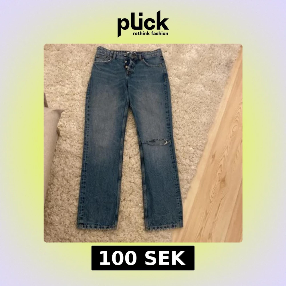 Snygga blå jeans från Zara med en klassisk straight fit. De har en knappgylf och slitna detaljer på framsidan. Perfekta för en avslappnad look.Innerbenslängd 75 cm, byxans totala längd 101 cm. Över lår 24 cm. Byxorna är i perfekt skick. Använda och tvättade vid 2 tillfällen.