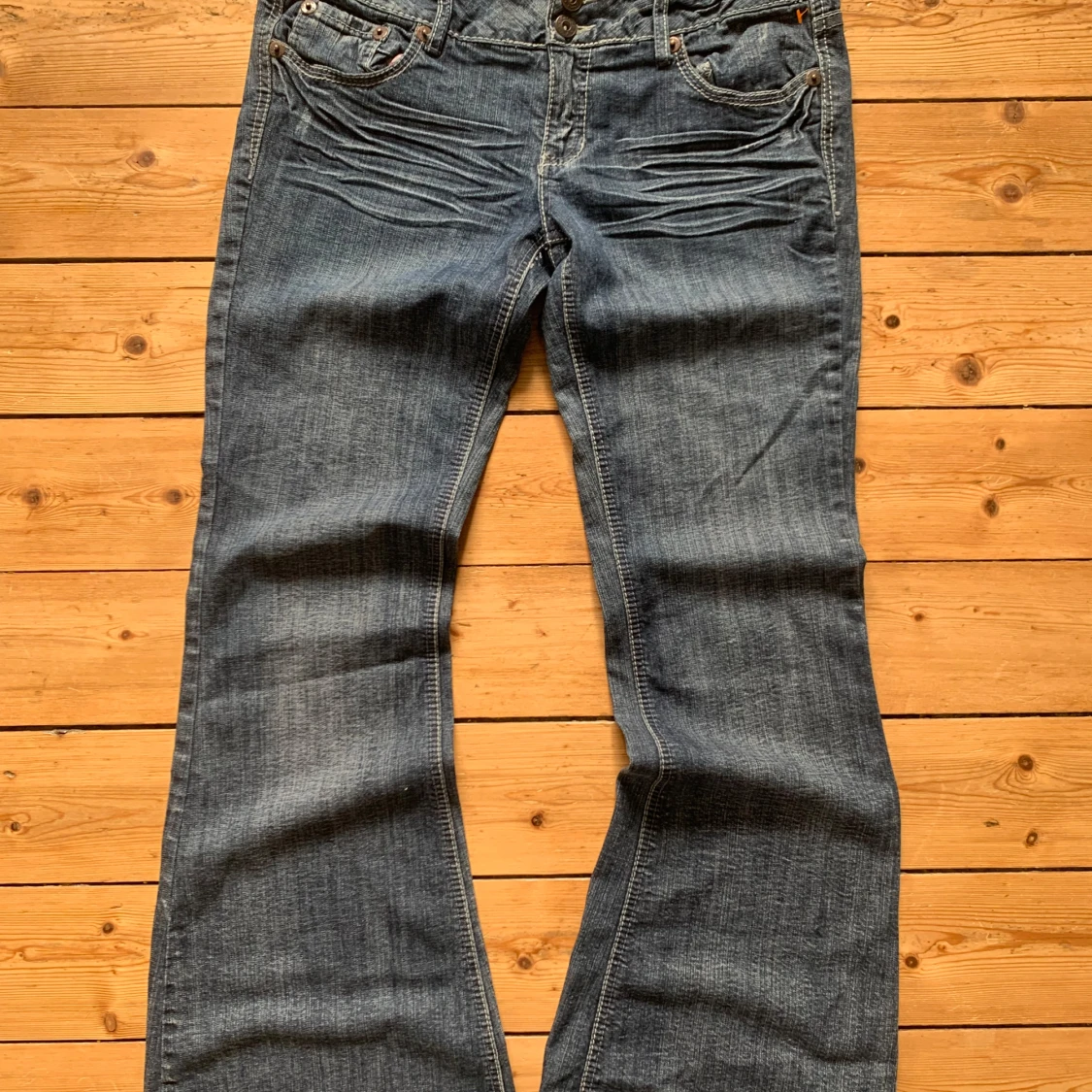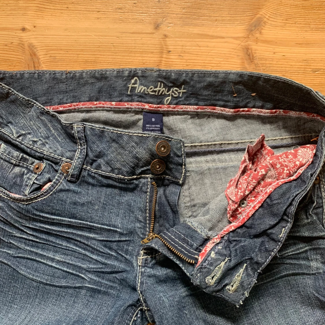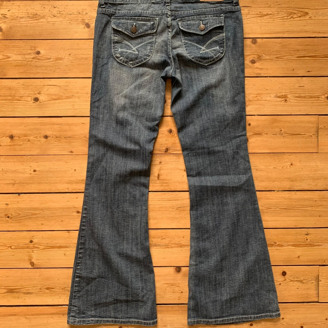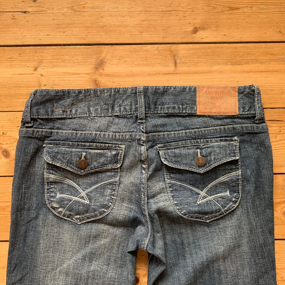 Snygga blå jeans från Amethyst med bootcut passform. Jeansen har dekorativa bakfickor med lock och knapp, dubbla knappar i midjan och coola slitningar framtill. Tillverkade i bomull med en liten del polyester för extra komfort. Storlek: W32 L30