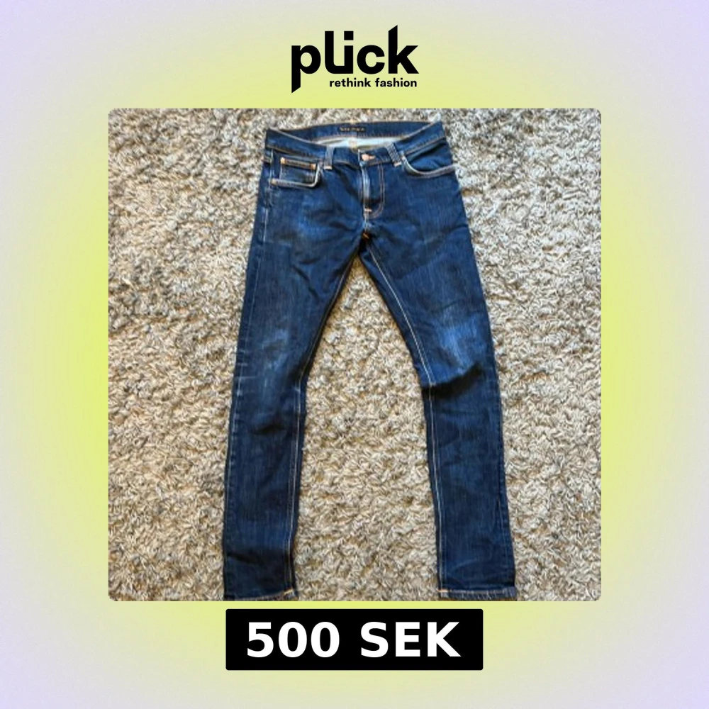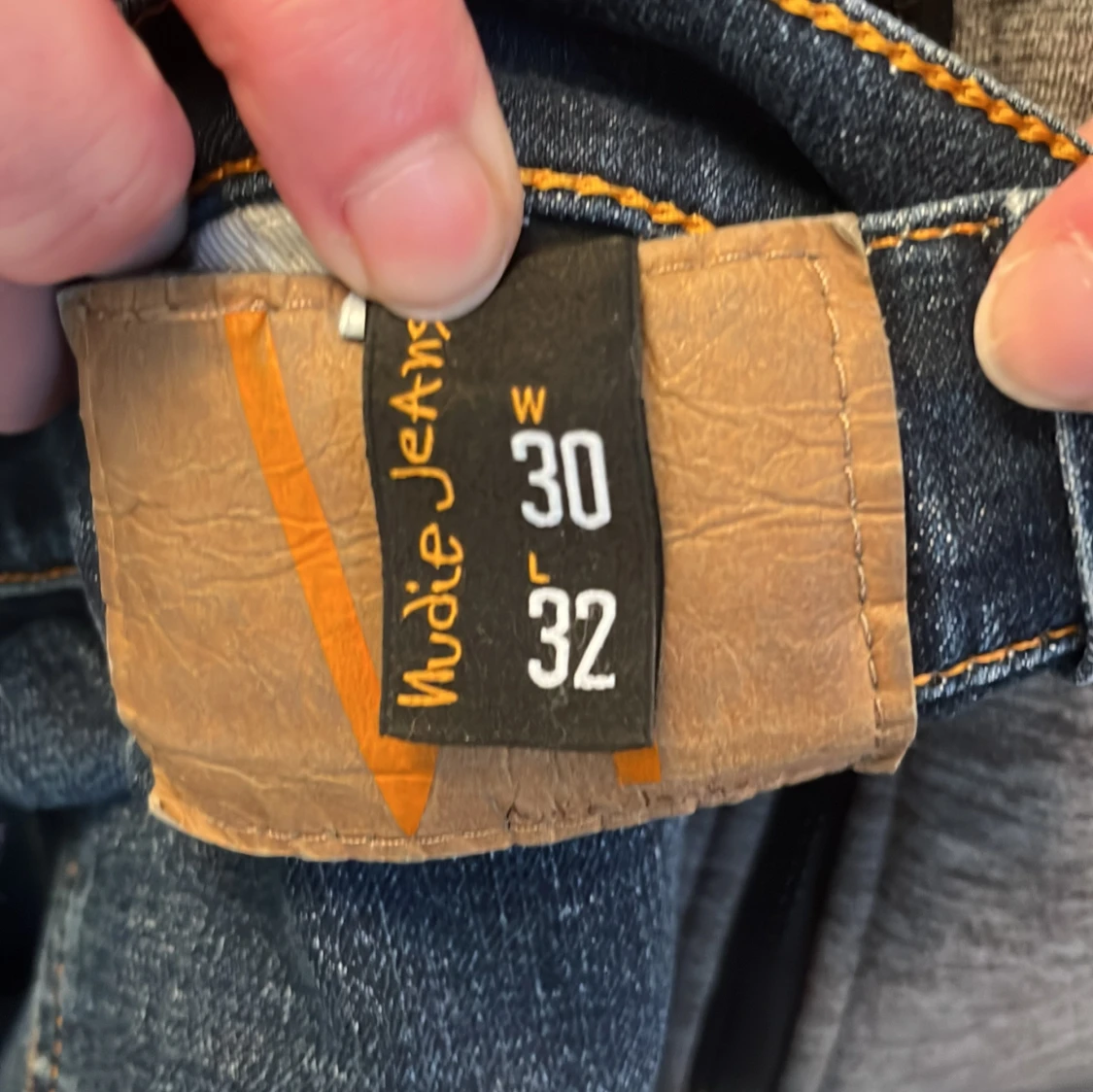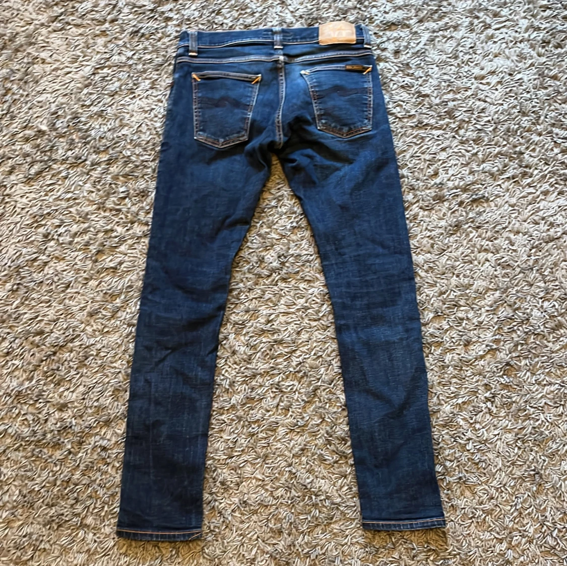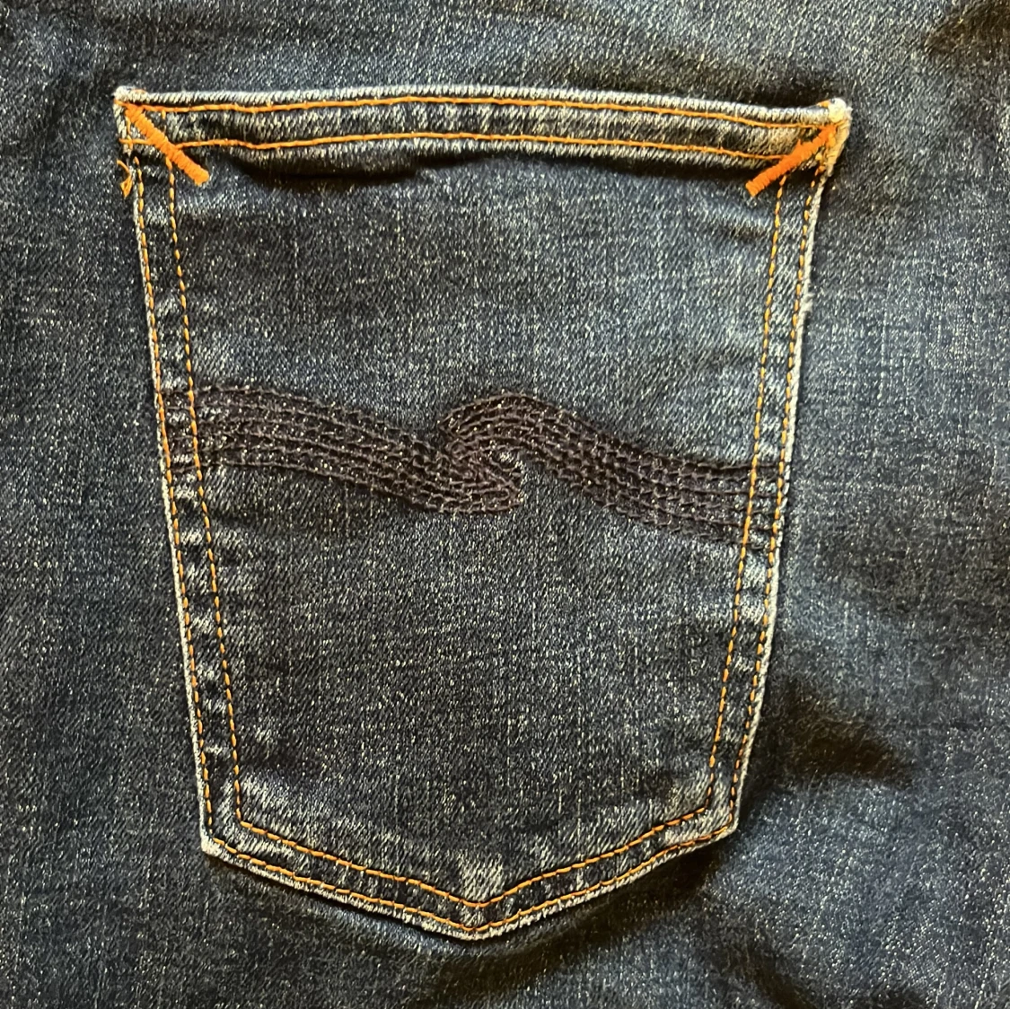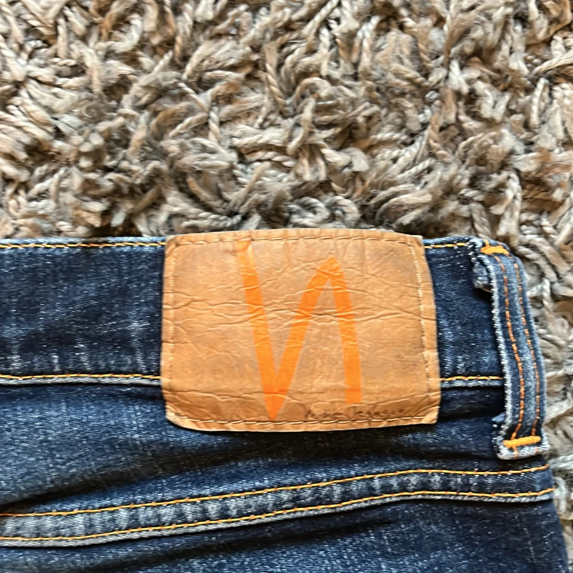 Säljer ett par mörkblå skinny jeans från Nudie med klassiska orange sömmar och vågig brodyr på bakfickorna. Jeansen har fem fickor, låg midja och är tillverkade i stretchig denim för en tight passform. Perfekta för dig som gillar en smal siluett. W30 L32.