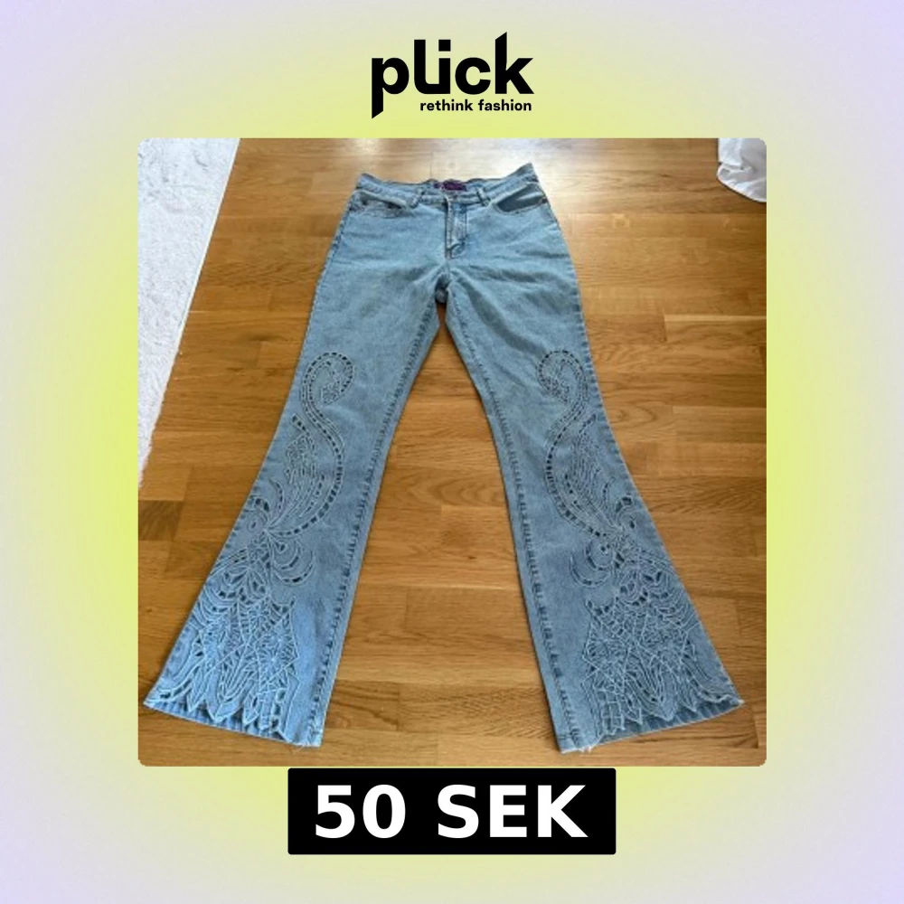Unika ljusblå bootcut jeans med snygga broderade detaljer längs benen💗Storlek M