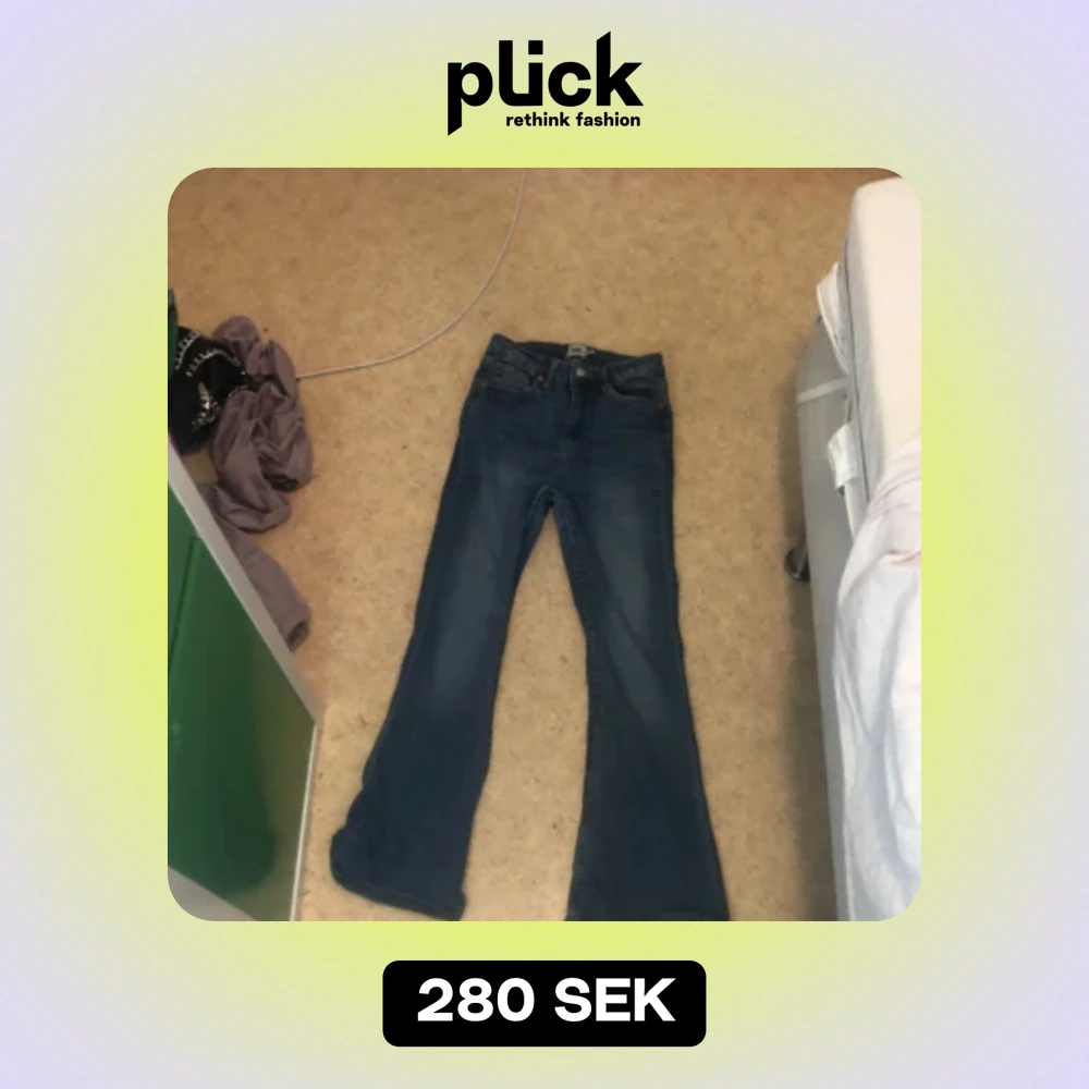 Ett par blå jeansbyxor i storlek S. Byxorna har en klassisk design med fickor både fram och bak. De har en något utsvängd passform. man kan diskutera om priset