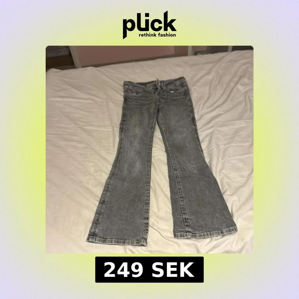 Snygga grå jeans från Gina Tricot i bootcut-modell. Jeansen har klassisk femficksdesign, normalhög midja och är tillverkade i ett mjukt denimtyg. Perfekta för dig som gillar en retro vibe och vill ha ett par jeans med lite utsvängda ben.
