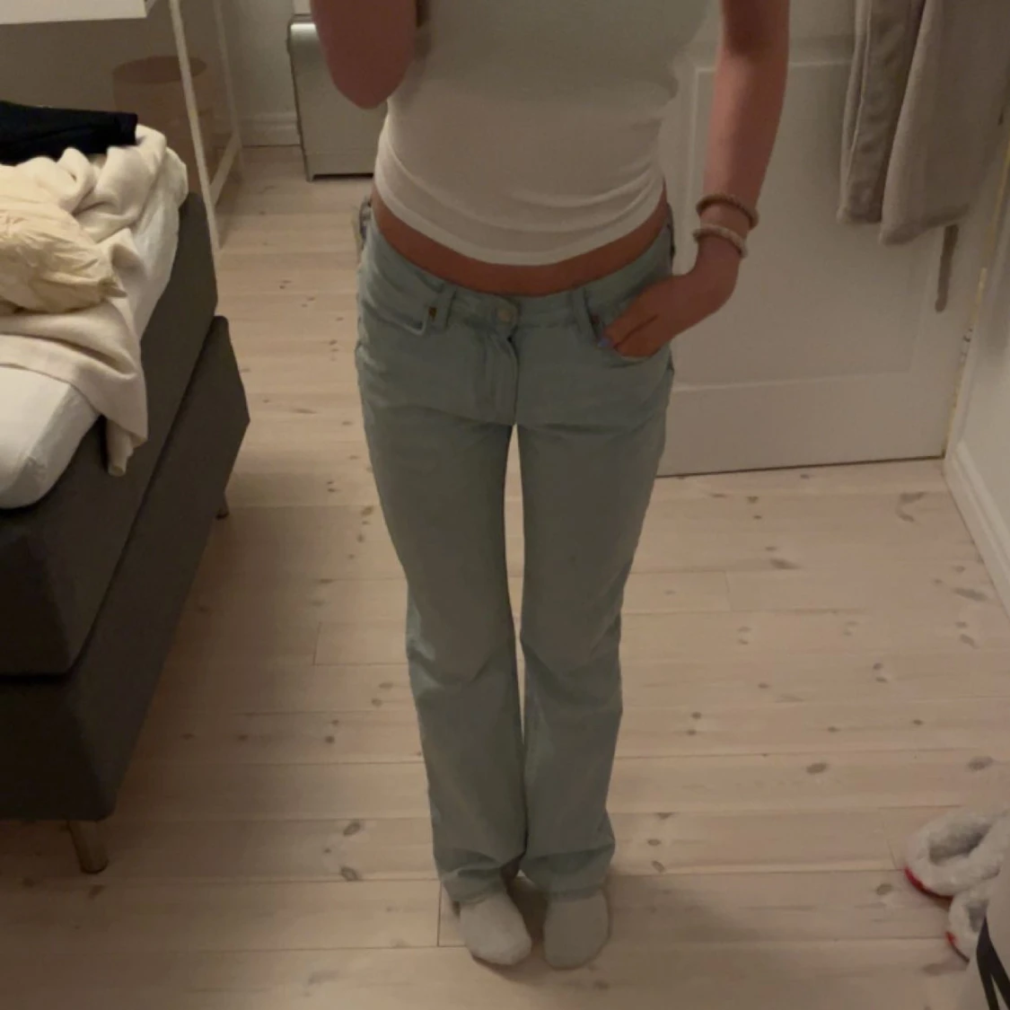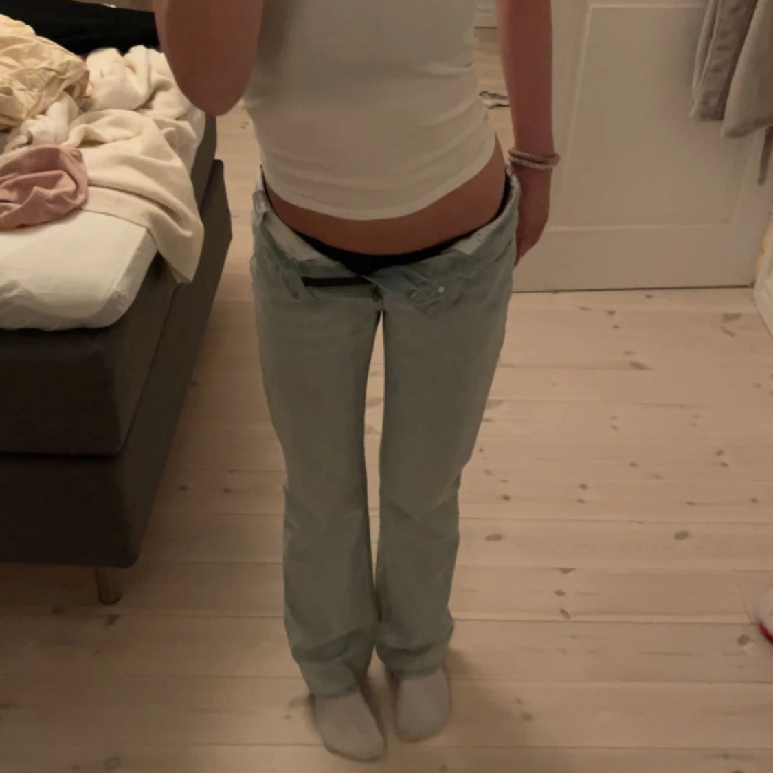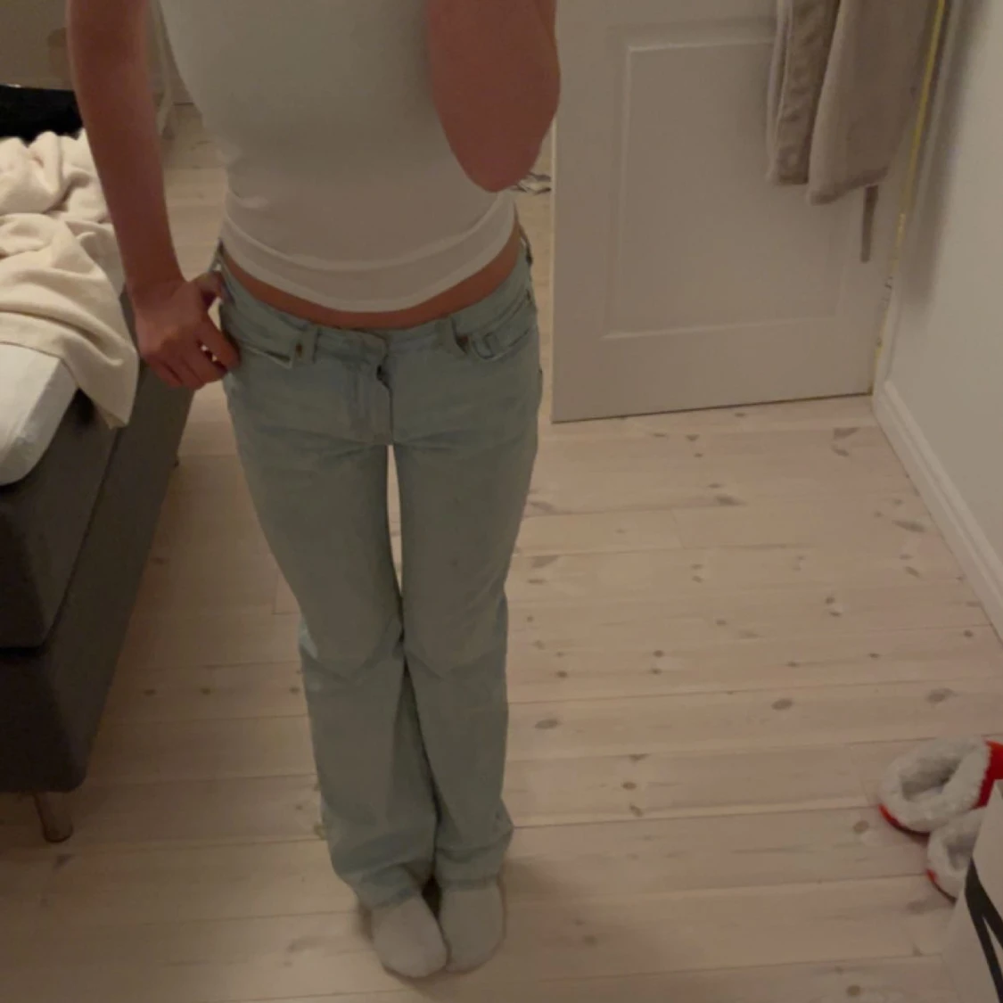Superfina jeans från bikbok! De är mid/low Waist och är i strl 25/32, innerbenslängden: 79cm Midjemåttet: 37cm tvärs över!
