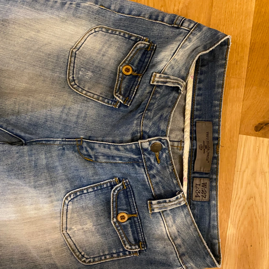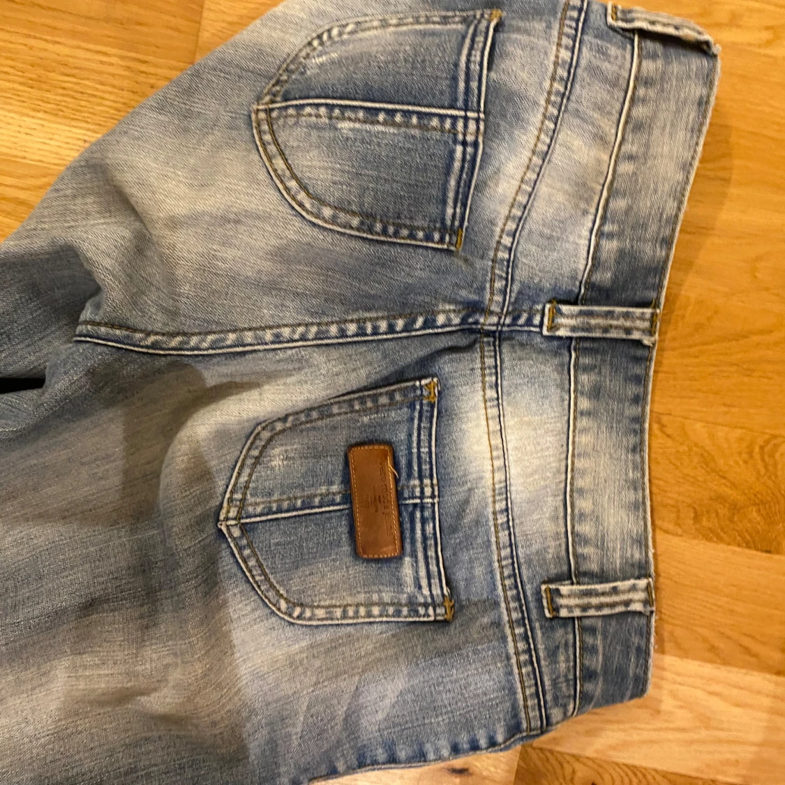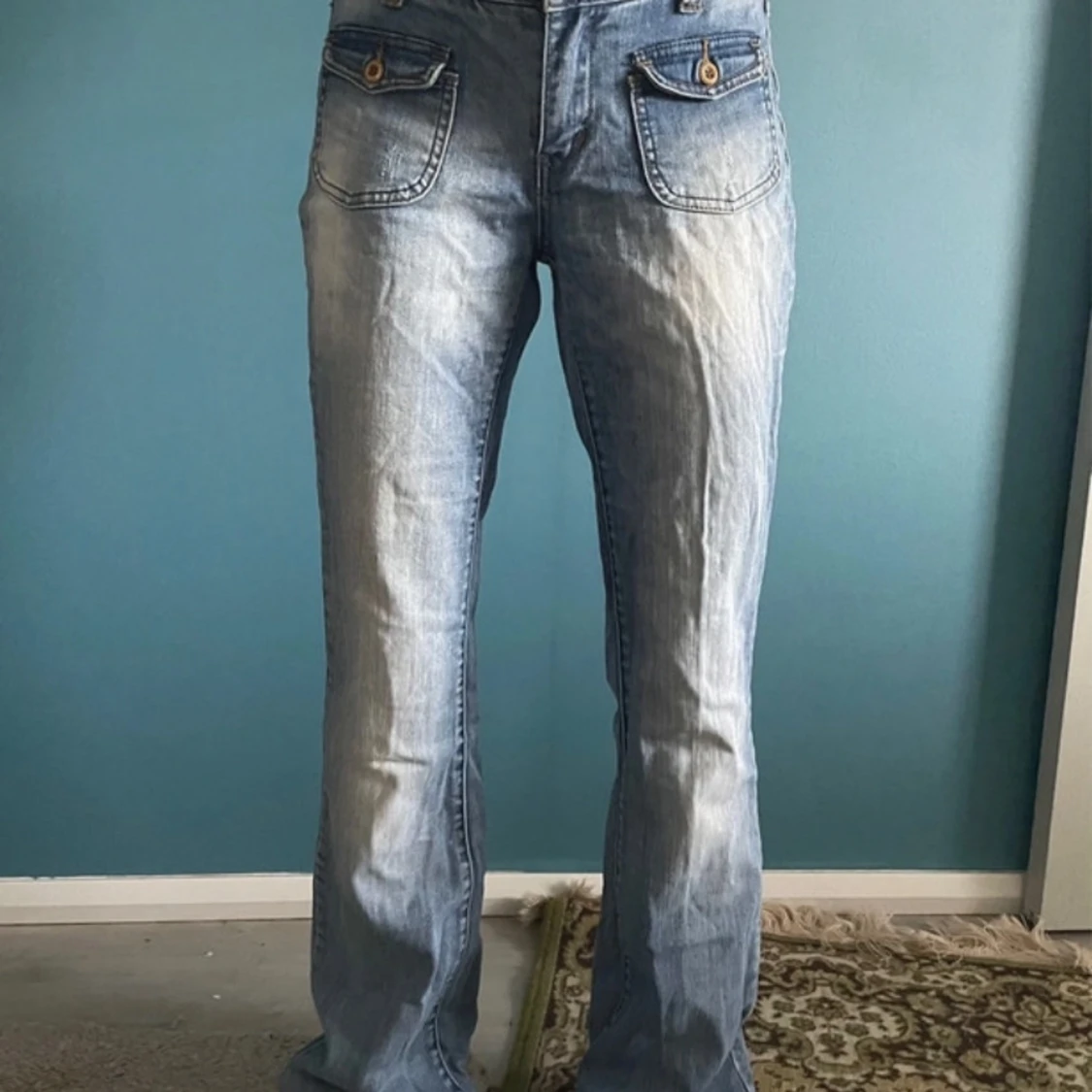 Säljer ett par snygga blå jeans med bootcut. De har en cool tvättad look och knappar på fickorna fram. Perfekta för en avslappnad stil och passar till det mesta. De är i bra skick och redo för nya äventyr!