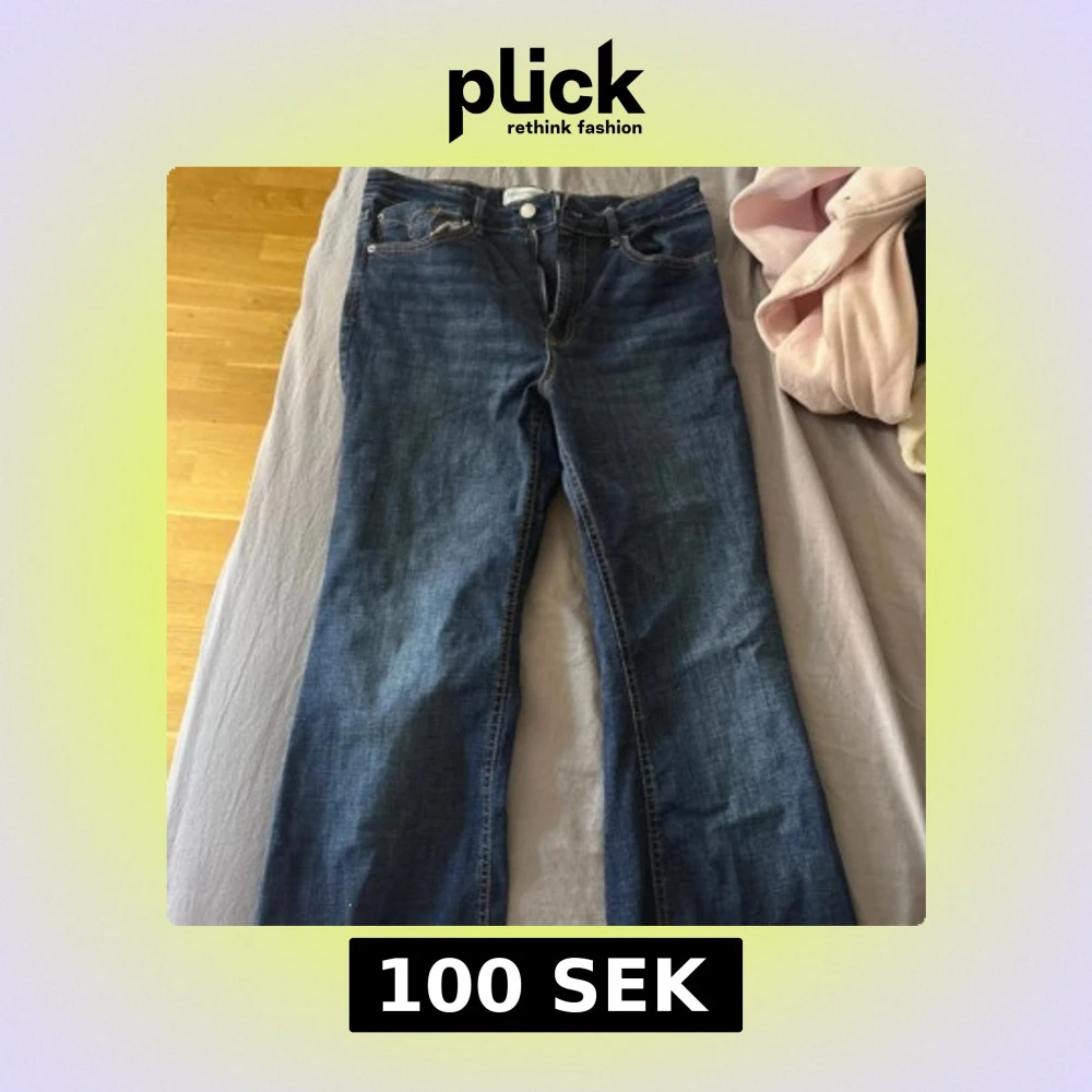 Säljer ett par klassiska blå bootcut jeans med fem fickor och knappgylf. Jeansen har en något utsvängd passform nertill och är perfekta för en avslappnad stil. Passar till det mesta och är ett måste i garderoben. Högmidjade och är aldrig använda!