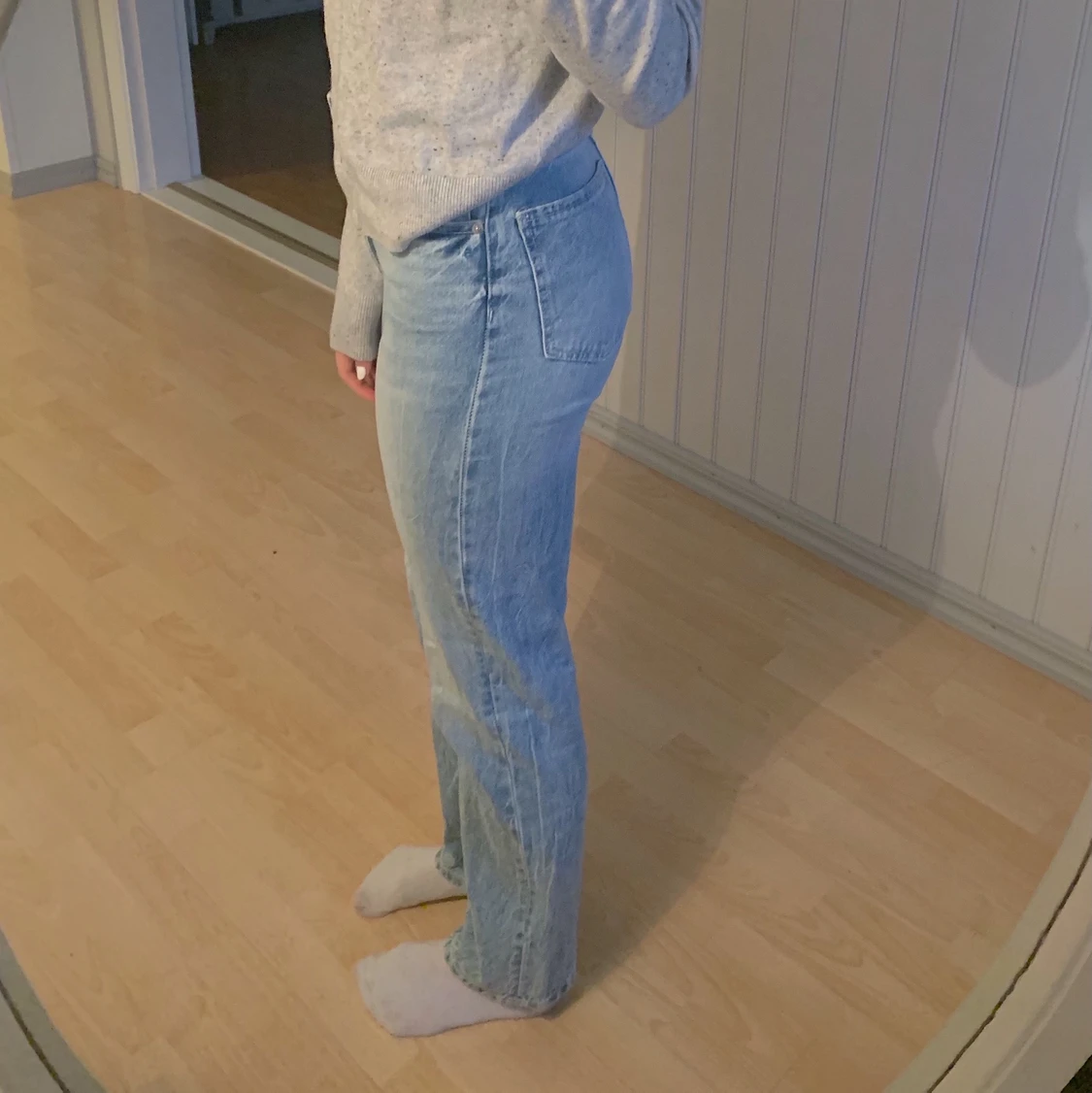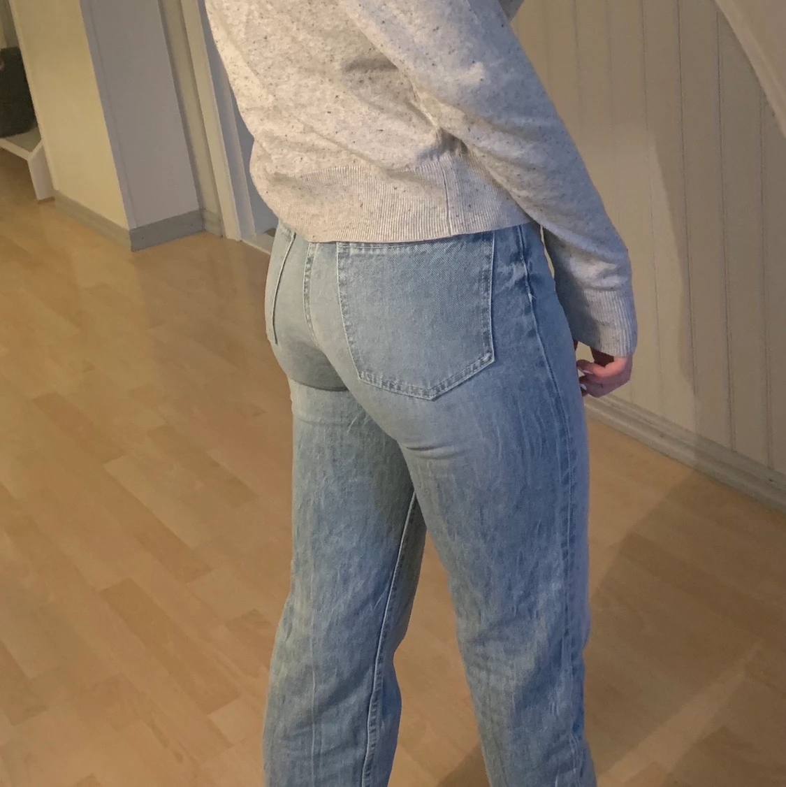 Ljusblå jeans som sitter vid naveln. Tajtare högre upp som sedan går ut lite. Fina i modellen och väldigt mjuka och bekväma. Köpta för 400 kr från zalando.