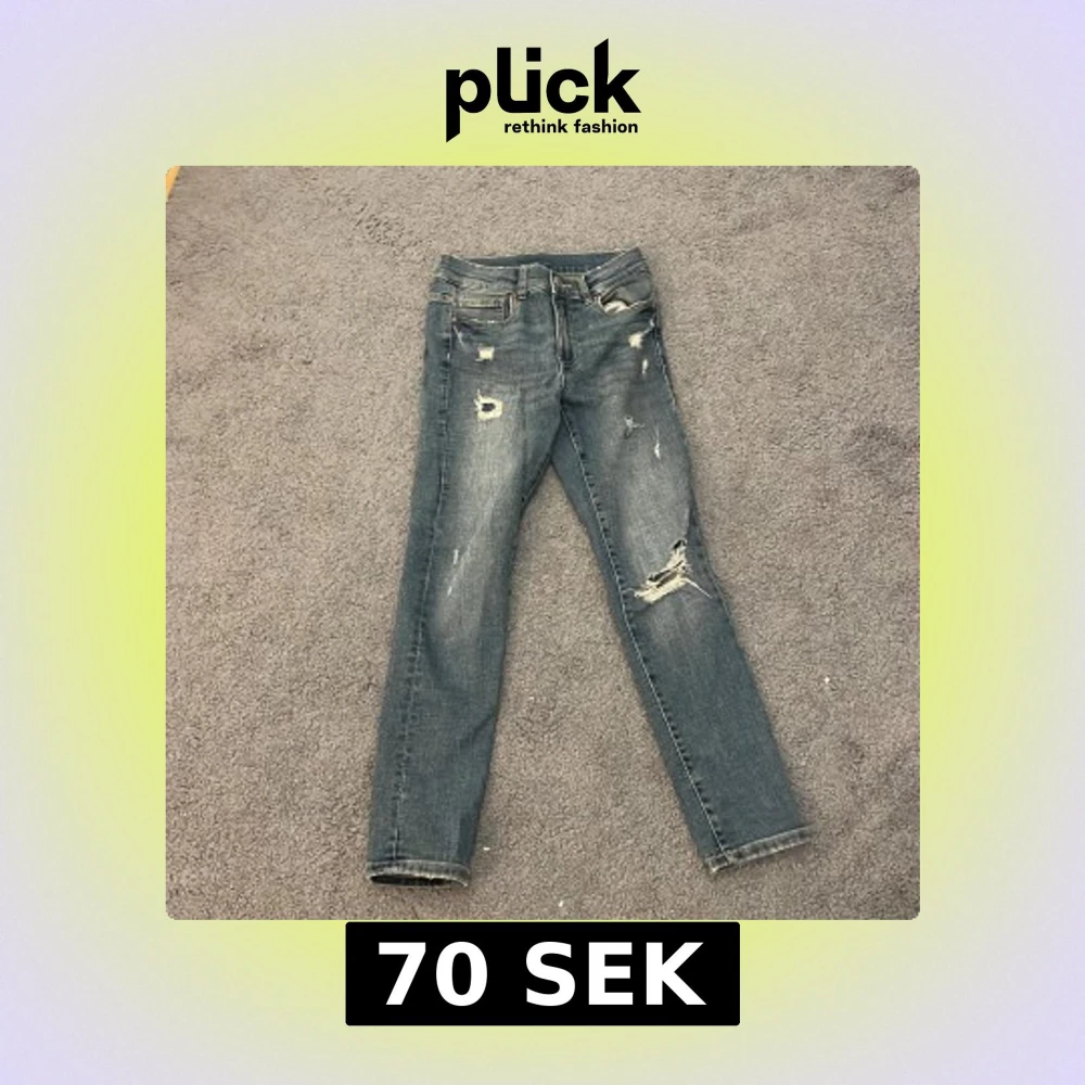 Säljer ett par blå slim jeans från Zara i storlek 10, med coola slitningar och trasiga detaljer på benen. Jeansen har klassisk femficksdesign och är tillverkade i stretchigt denim för en bekväm passform.