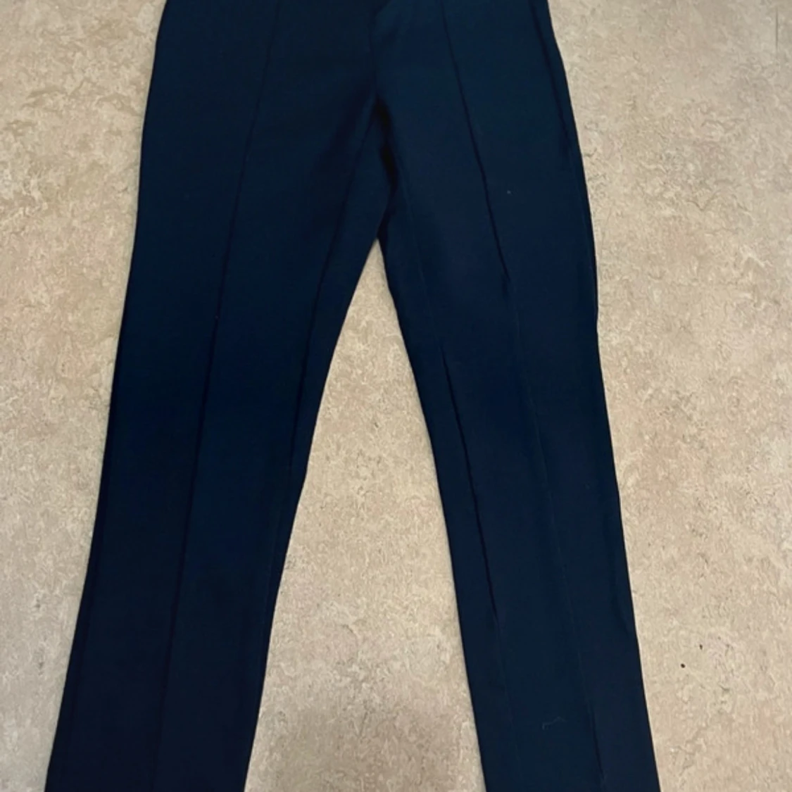 Mörkblå kostymbyxor från Zara Kids i storlek 140. Byxorna har klassisk rak passform med pressveck framtill och resår i midjan för extra komfort. Perfekta för en stilren look och lätta att matcha med skjorta eller tröja.