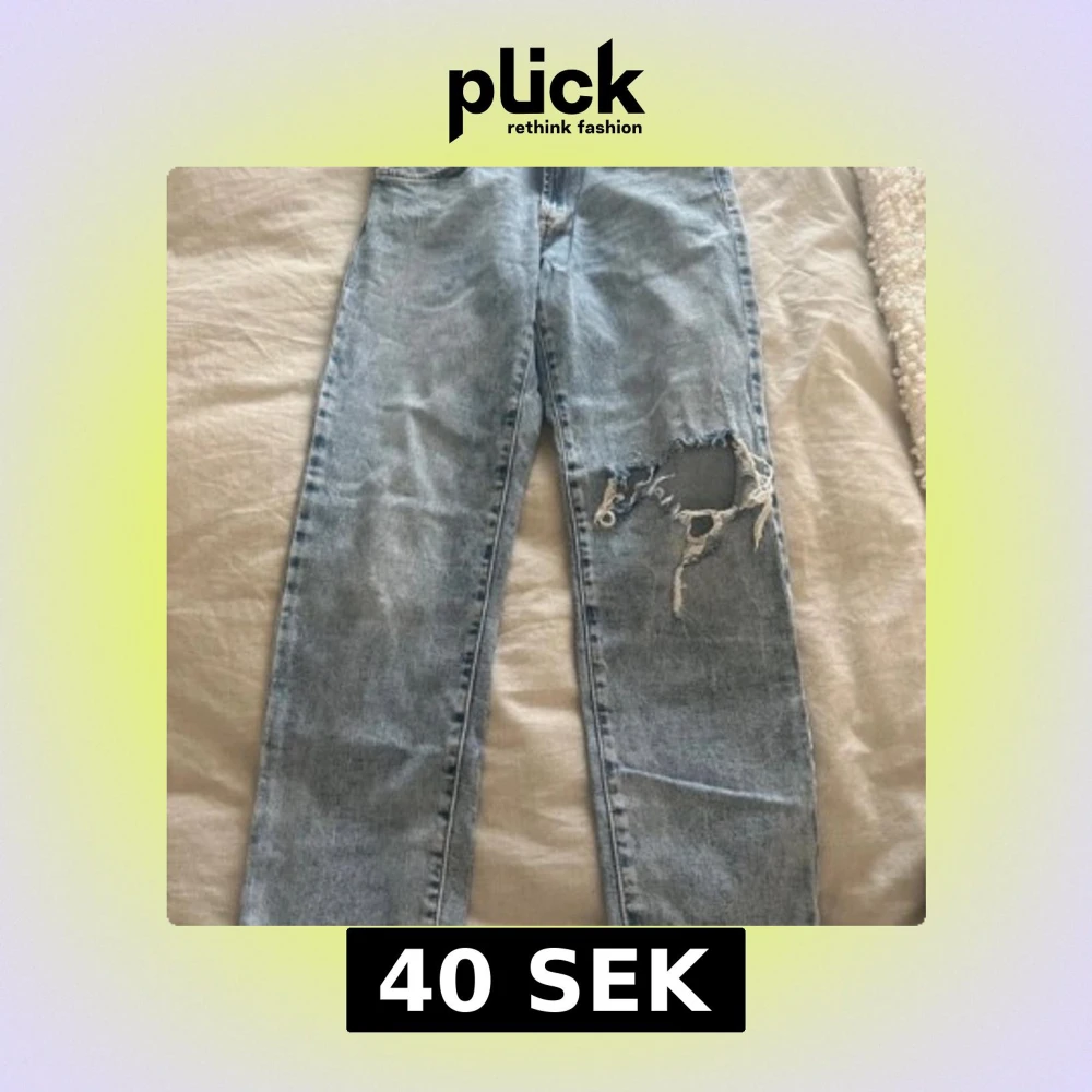 Säljer ett par ljusa jeans från Zara med slitna detaljer på ena benet. De har en klassisk femficksdesign och knappgylf. Perfekta för en avslappnad stil.