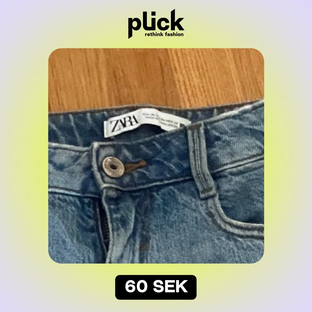 Ett par blå jeans från Zara i storlek EUR 36 / US 04 / MEX 26. Jeansen har en klassisk femficksdesign och är tillverkade i Bangladesh. De har en knapp och dragkedja framtill samt en läderlapp med 'Zara Denim' på baksidan.