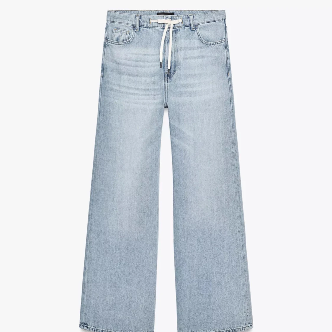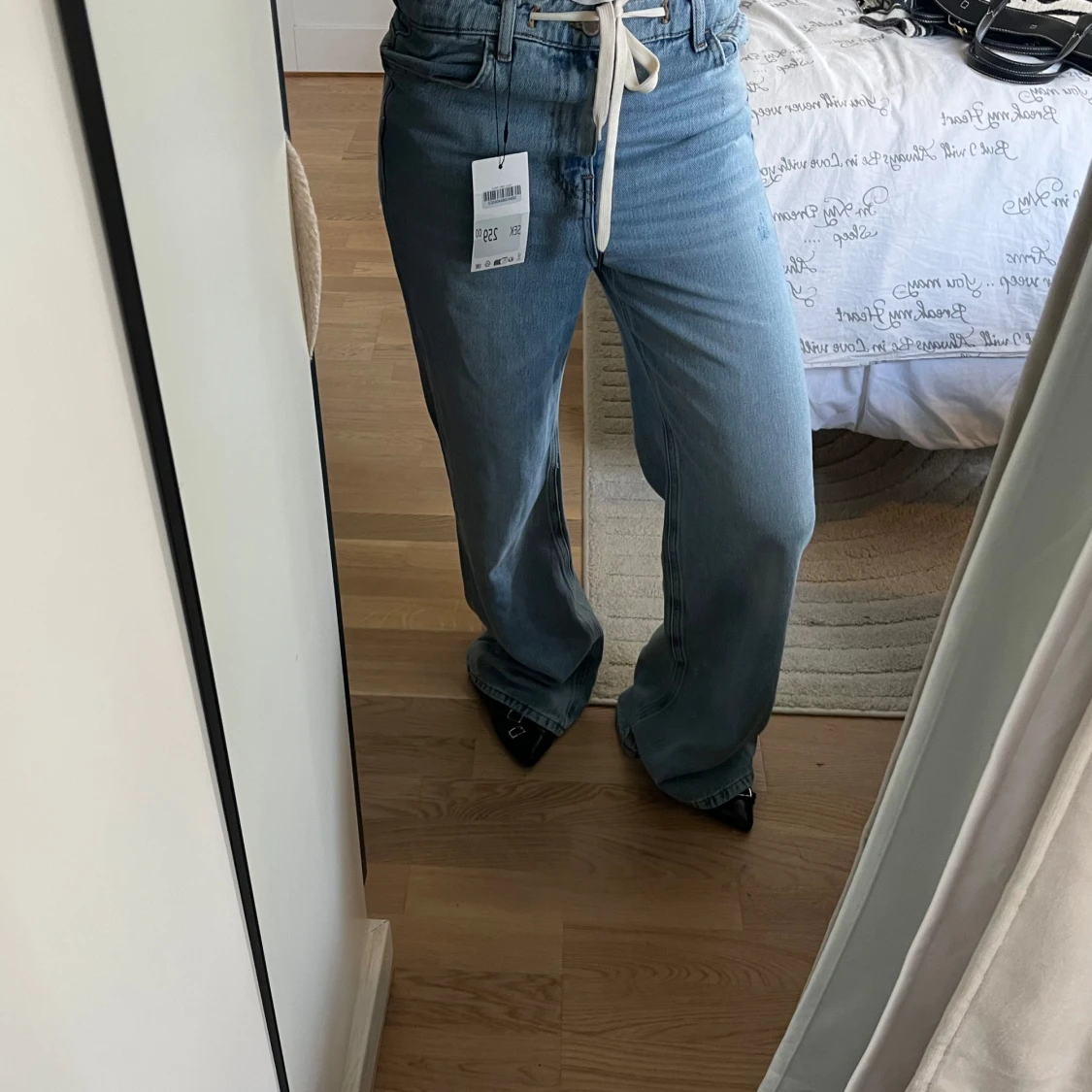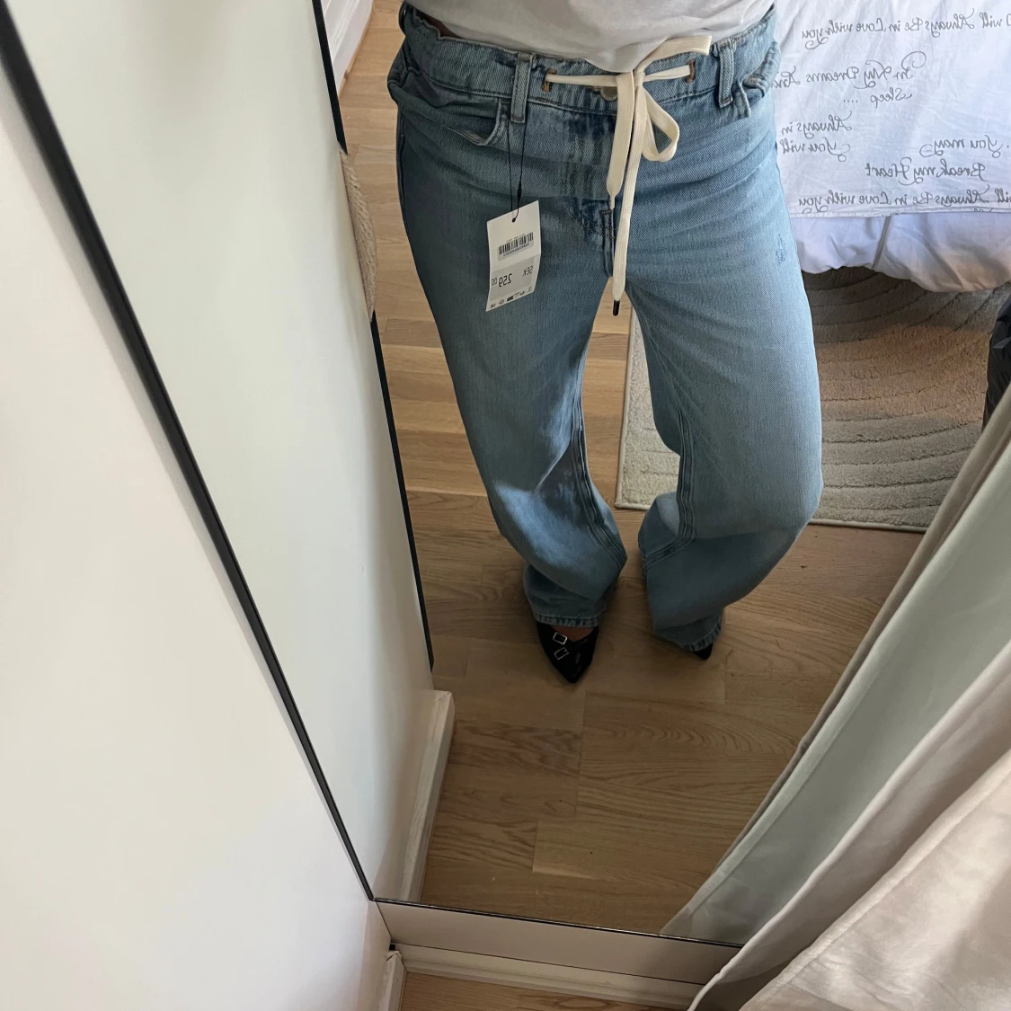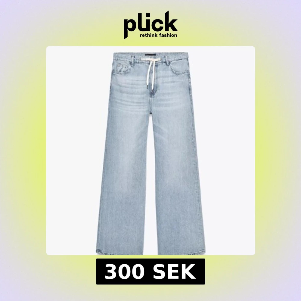 Säljer ett par ljusblå jeans med breda ben. Jeansen har en snygg snörning i midjan.Tillverkade i jeansmaterial. Ascoola jeans men inte riktigt min stil, jag är 170 och de är lite för långa för mig. Storlek 32 men skulle säga att det är 34/36. Slutsålda på Zaras hemsida