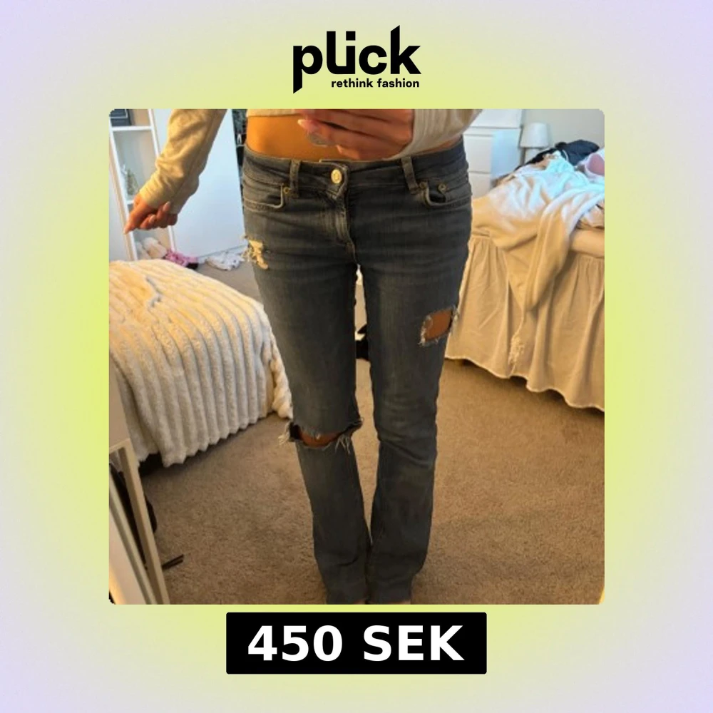 Säljer ett par blå bootcut jeans med snygga slitningar och hål på knäna. De har låg midja och klassisk femficksdesign. Jeansen är gjorda i mjukt denim och har en cool, avslappnad vibe. Perfekt för dig som gillar en edgy stil.