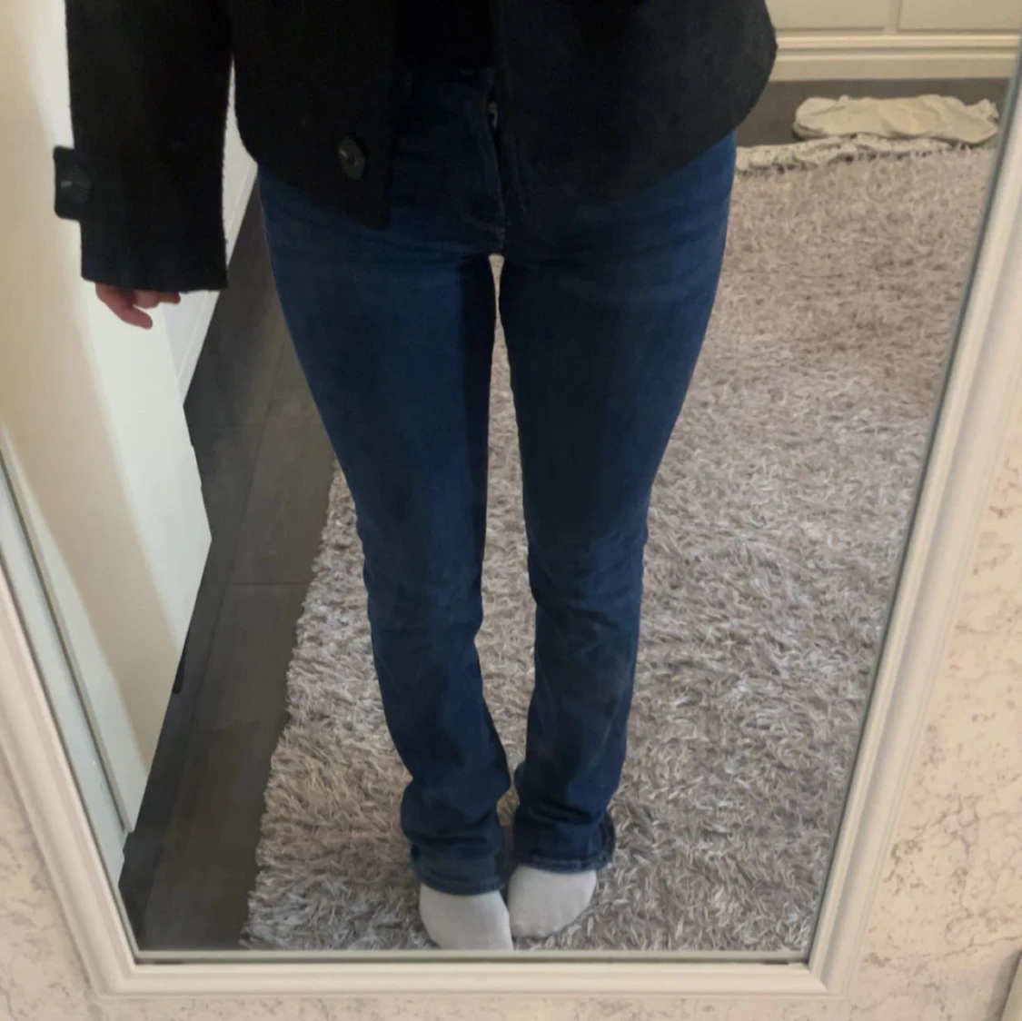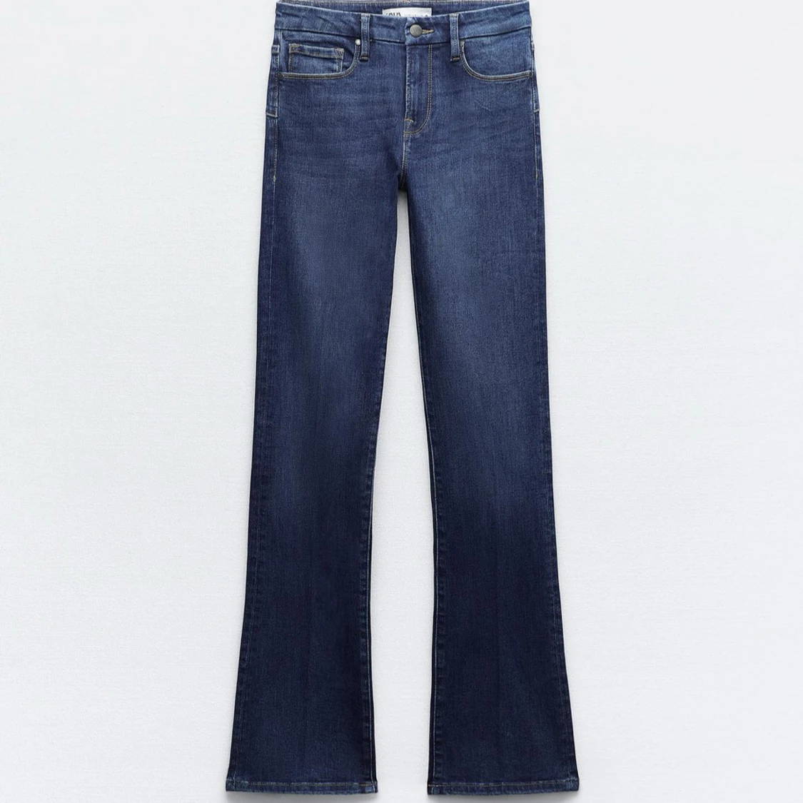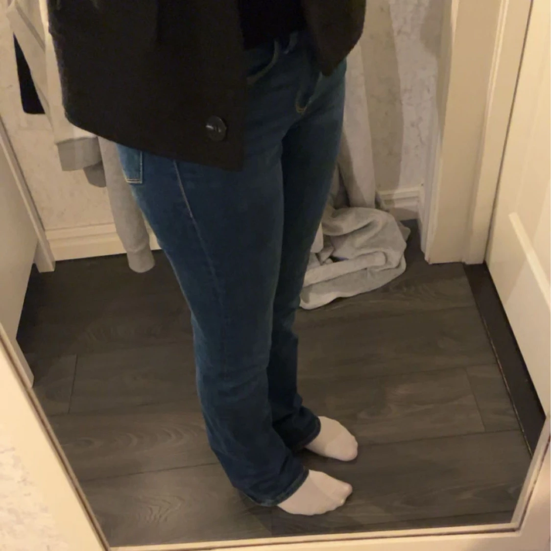 Snygga mörkblå bootcut jeans med medelhög midja. Från Zara i storlek 34 skick 8/10💖