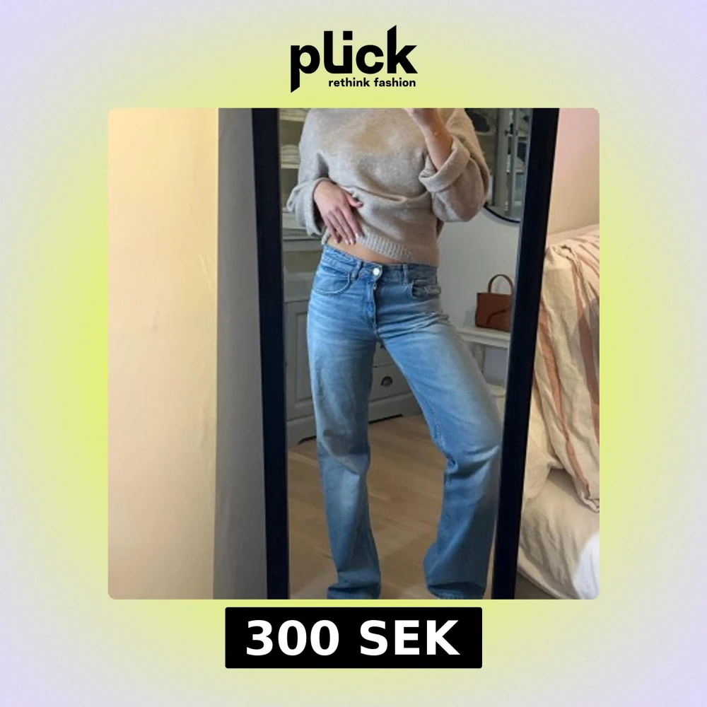 Säljer ett par super snygga, raka jeans från Zara, med en mellan hög midja, men fortfarande inte hög. Byxorna är använda men i ett mycket bra skick! Storlek 34