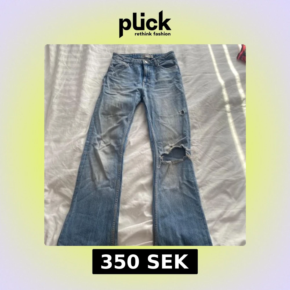 Snygga ljusblå bootcut jeans från Zara med slitningar och en fläck av blekningsmedel på ena benet. Klassisk femficksmodell med dragkedja och knapp. Jeansen har en avslappnad vibe och är tillverkade i bomull med en skön passform.