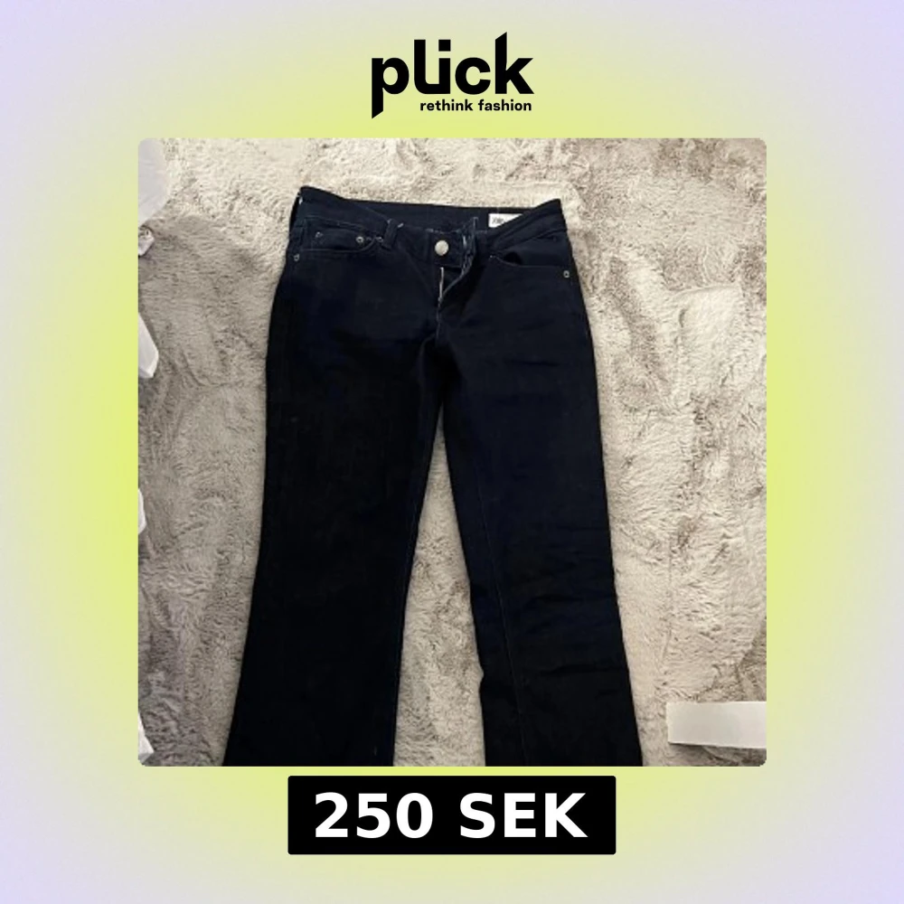 Snygga mörkblå jeans från Zara som är låg midjade och bootcut. dragkedja och knapp framtill samt bälteshällor. Storleken är 34.