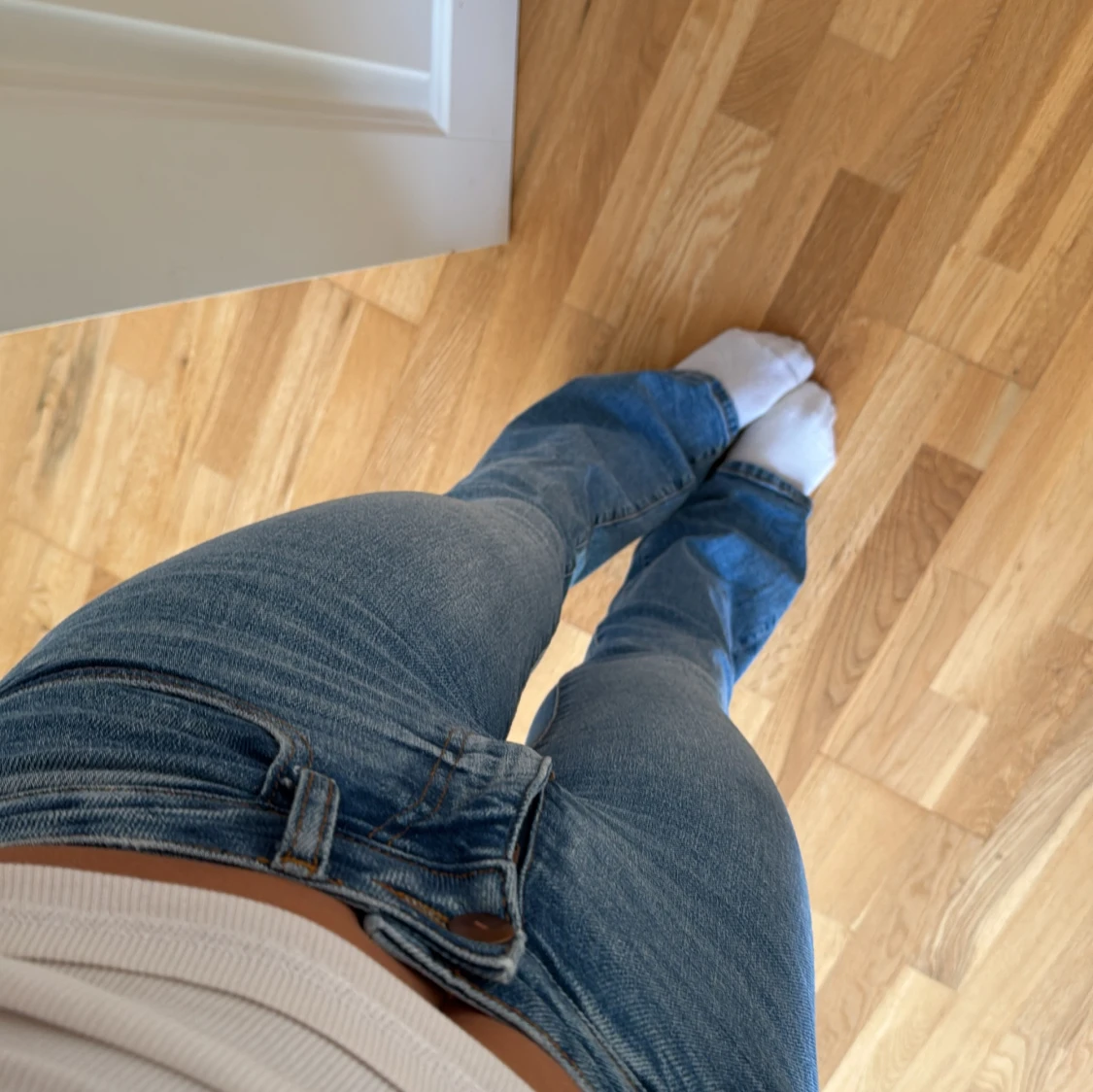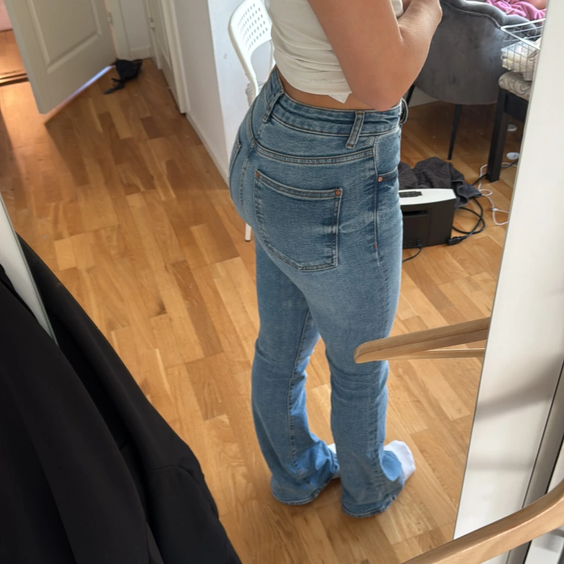 Säljer ett par ljusblå bootcut jeans med klassisk femficksdesign och normal passform. Jeansen har mellan midja och är tillverkade i mjukt denimtyg som sitter snyggt över höfterna och låren innan de släpper ut vid bensluten.