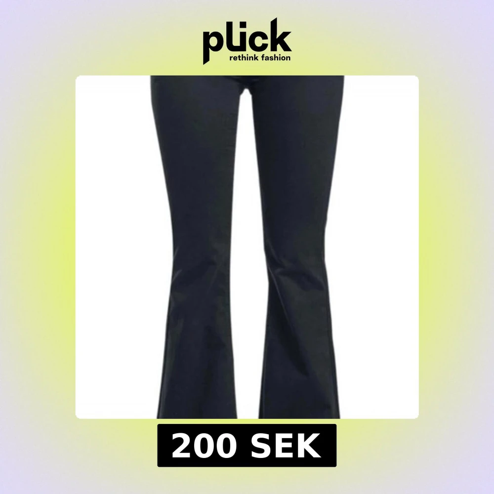 Säljer ett par svarta bootcut jeans med klassisk femficksdesign och låg midja. Jeansen har en snygg utsvängd passform nertill och är perfekta för dig som gillar en retrostil. Materialet är jeans och färgen är mörk svart.