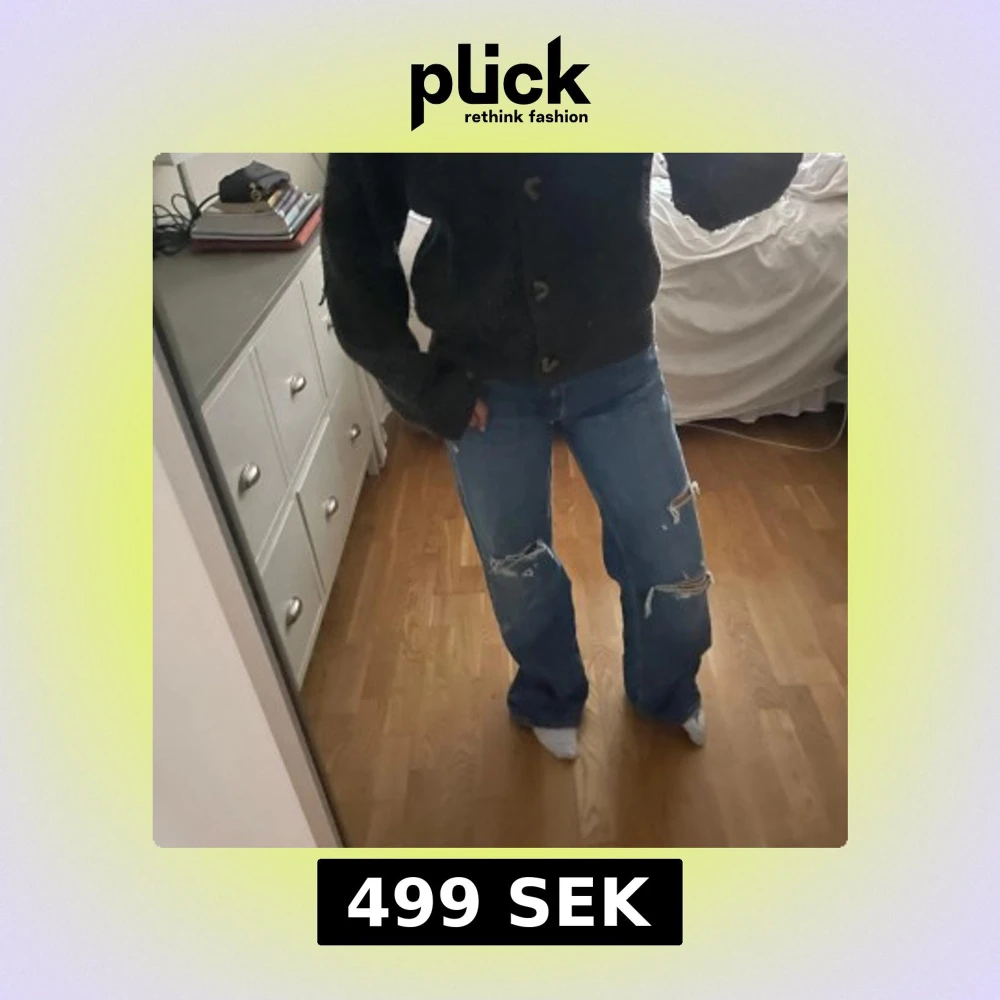 Säljer ett par blå jeans med slitna detaljer och hål på benen. Jeansen har en loose passform. Lätta att styla snyggt skriv vid funderingar pris kan diskuteras vid snabb affär 🩷