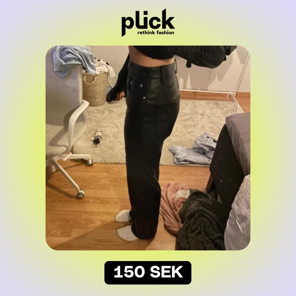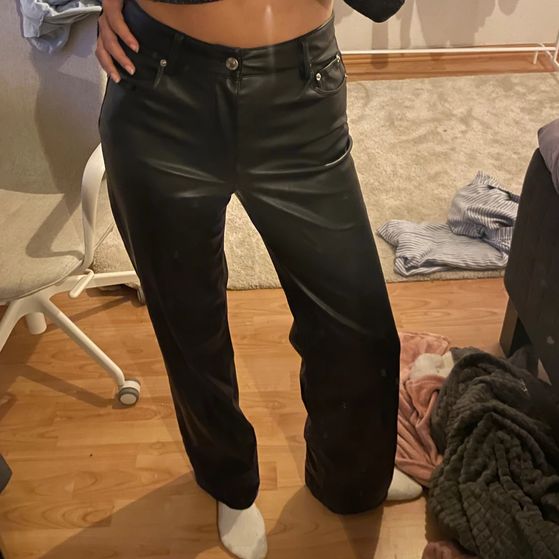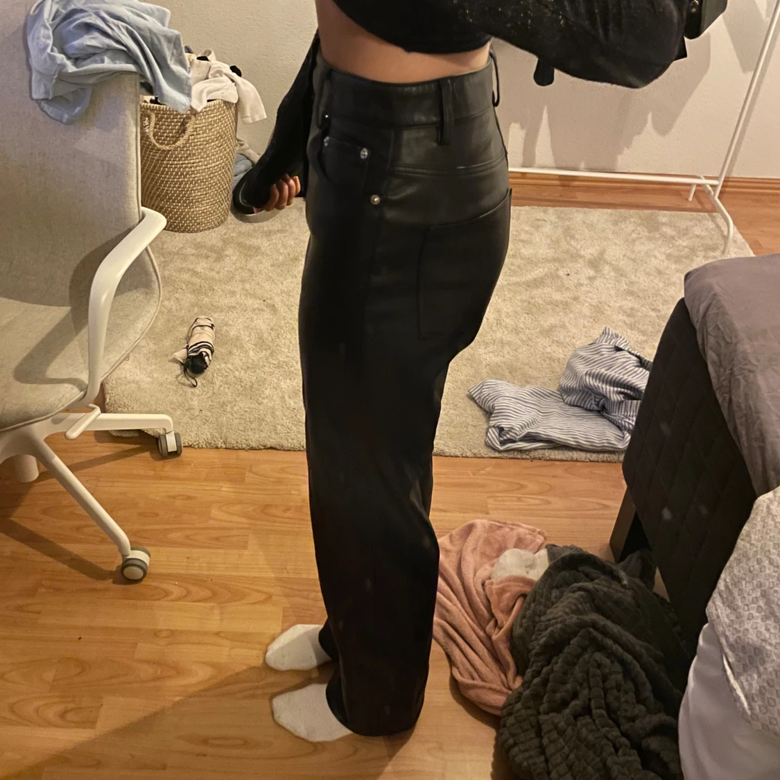 zara svarta byxor i skinnimitation med mid midja och normal passformđȘ©đȘ©