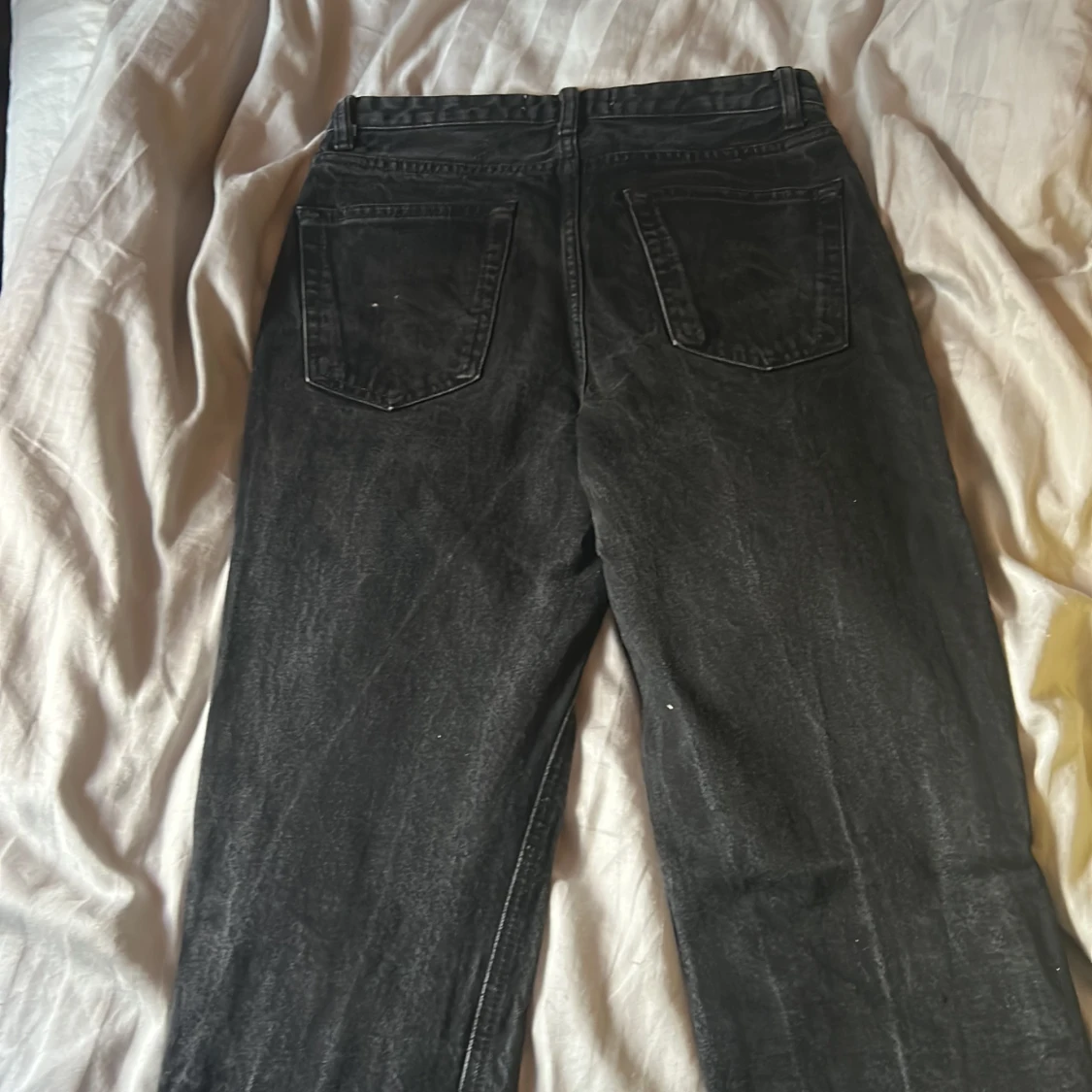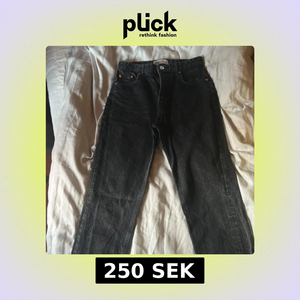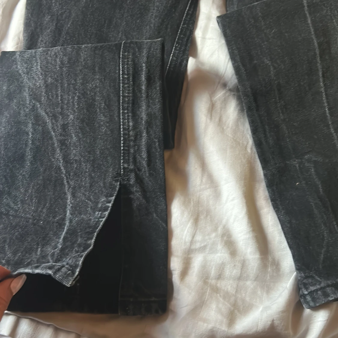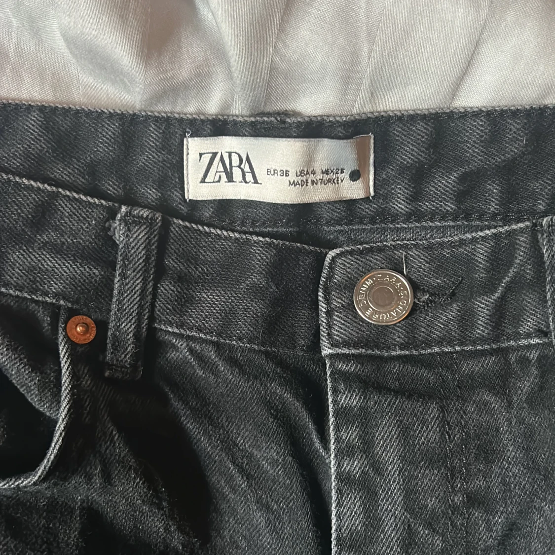 Snygga svarta jeans från Zara i klassisk femficksmodell. Jeansen har hög midja, raka ben och coola slitsar nertill vid bensluten. Materialet är kraftig denim i bomull och färgen är tvättad svart för en lite vintage känsla.