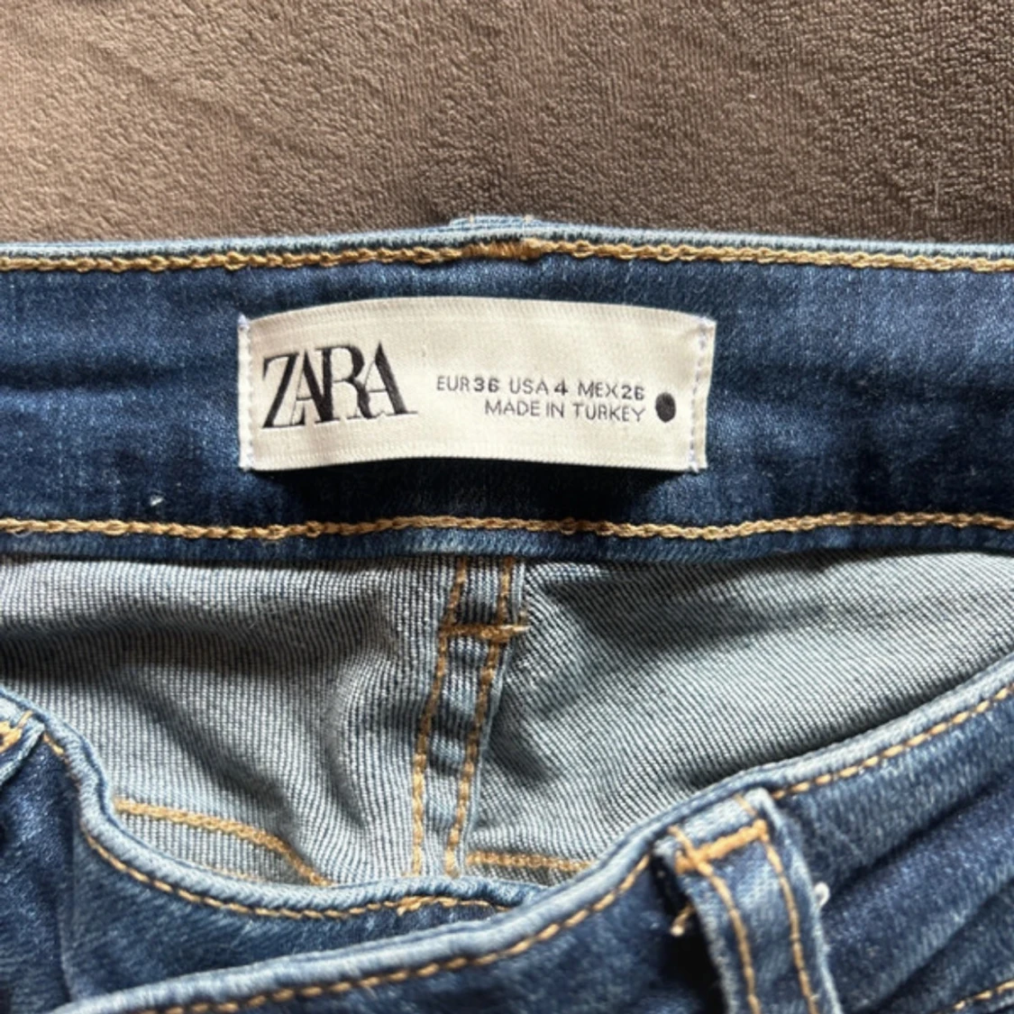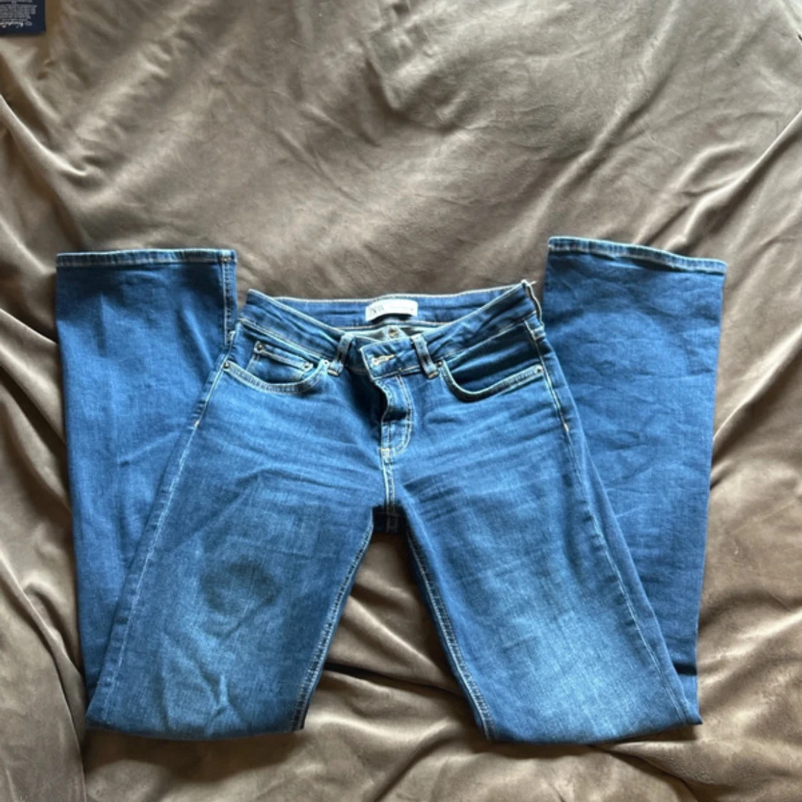 Snygga blå bootcut jeans från Zara i storlek 36. Klassisk femficksmodell med normal passform och medelhög midja. Jeansen är tillverkade i mjukt denimtyg och har en stilren look med ljusblå tvätt och kontrastsömmar.