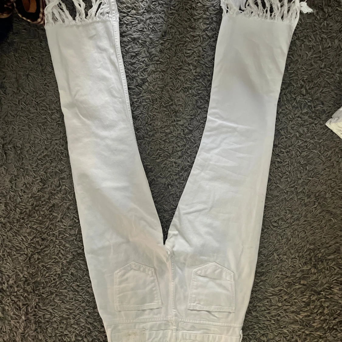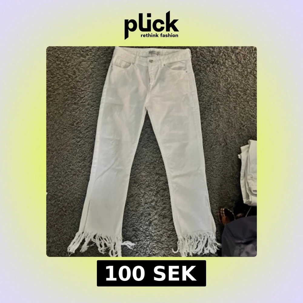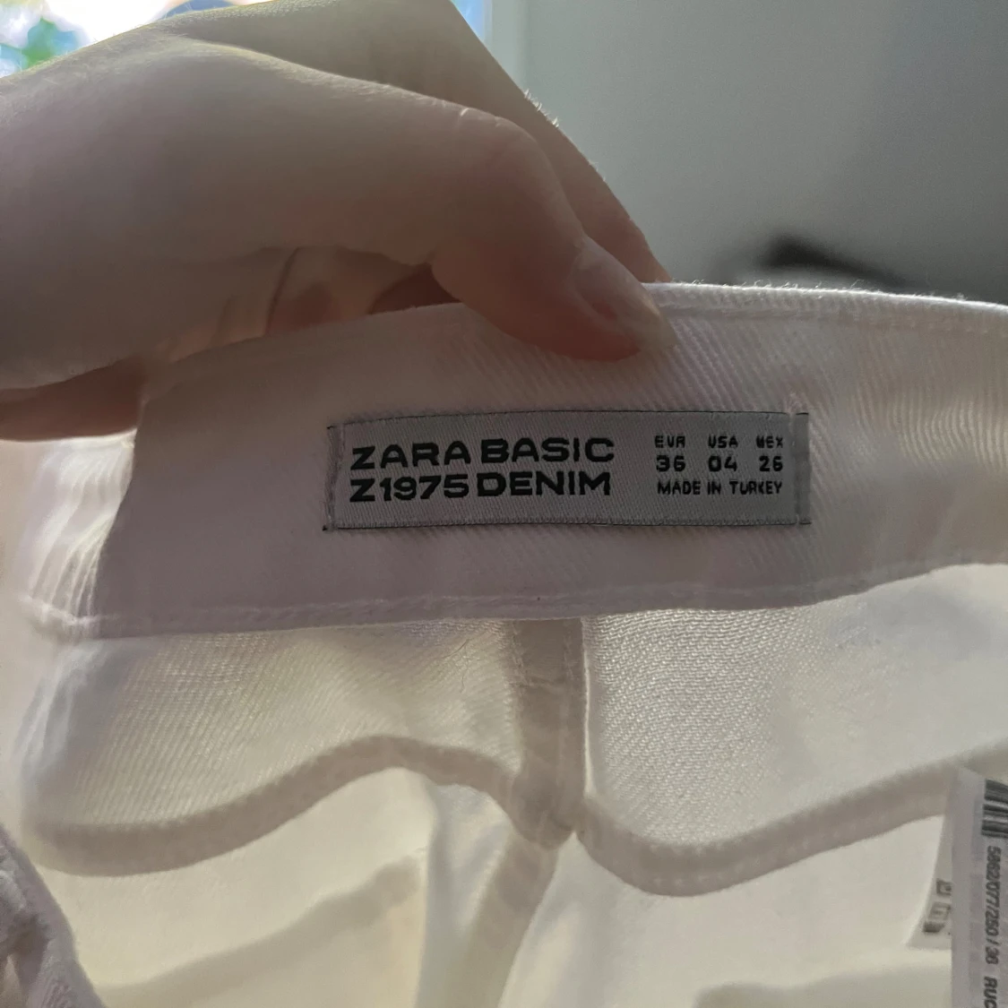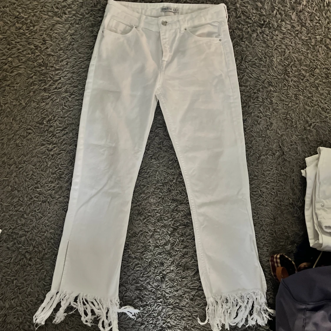 Säljer ett par vita jeans från Zara Basic Z1975 Denim i storlek 36. Byxorna har raka ben med snygga fransar längst ner och klassisk femficksdesign. Materialet är denim och modellen är midwaist med dragkedja och knapp framtill. Liten i storlek