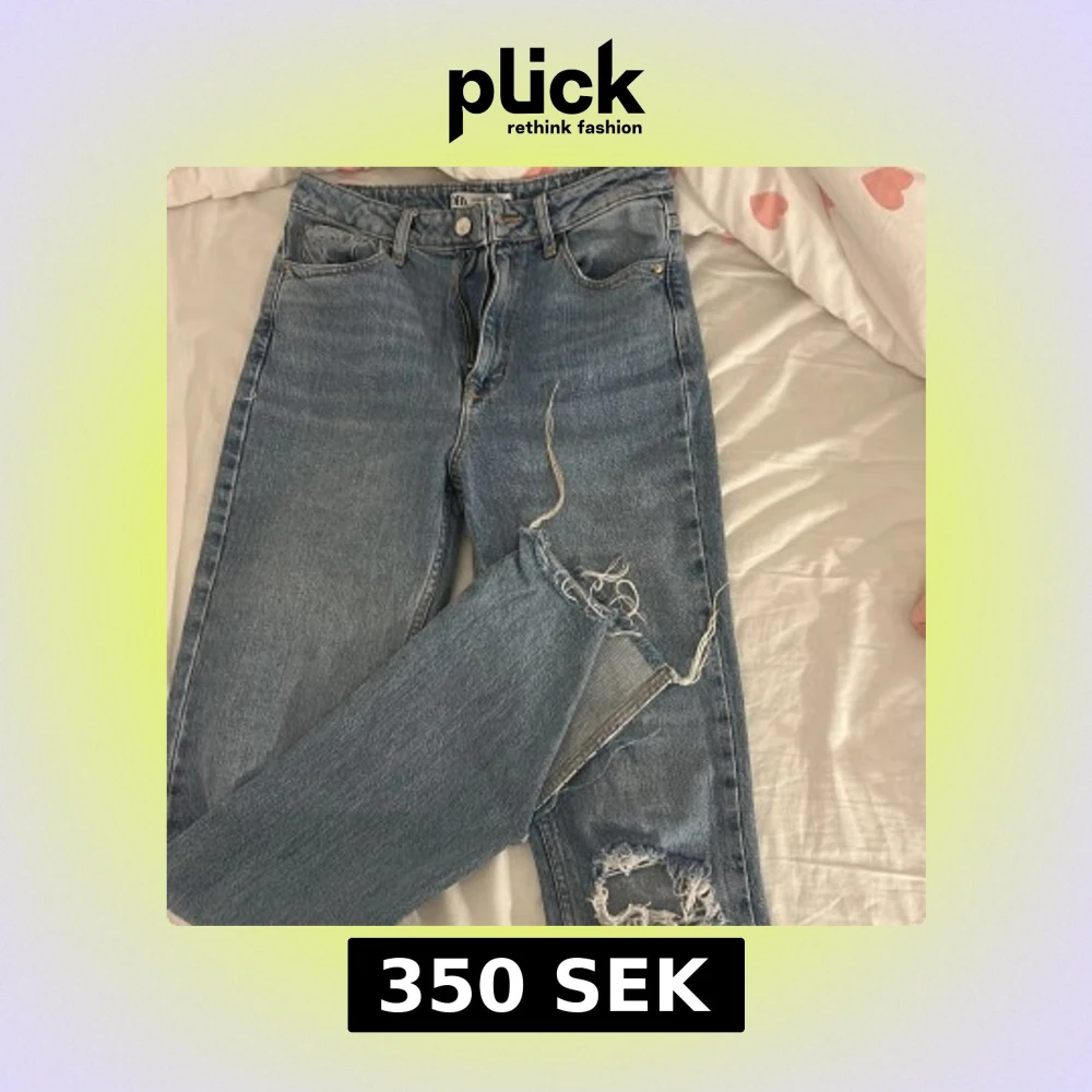 Säljer ett par blå jeans från Zara med snygga slitningar och hål på båda benen. Klassisk femficksmodell med dragkedja och knapp framtill. Jeansen är utsvängda och har en hög midja. Använda en gång💕