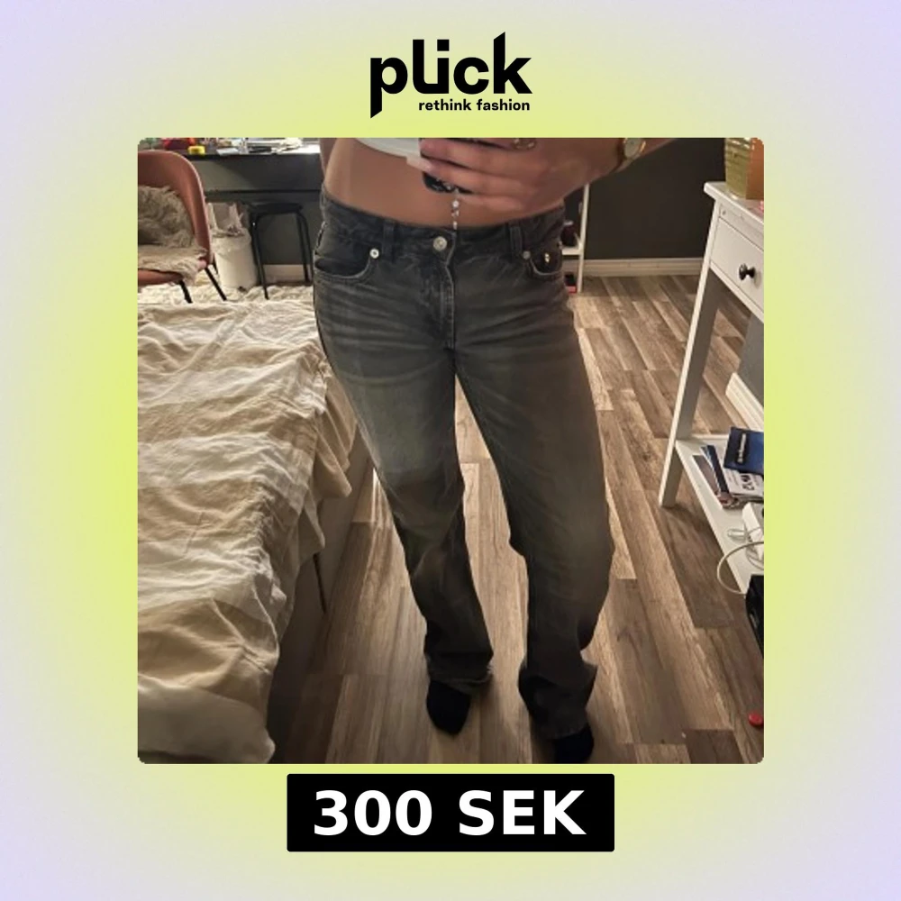 Säljer ett par grå jeans med snygg tvätt och klassisk femficksdesign. Modellen har låg midja och bootcut-ben som ger en chill och avslappnad vibe. Jeansen är tillverkade i jeansmaterial och har silverfärgade nitar och knapp framtill.