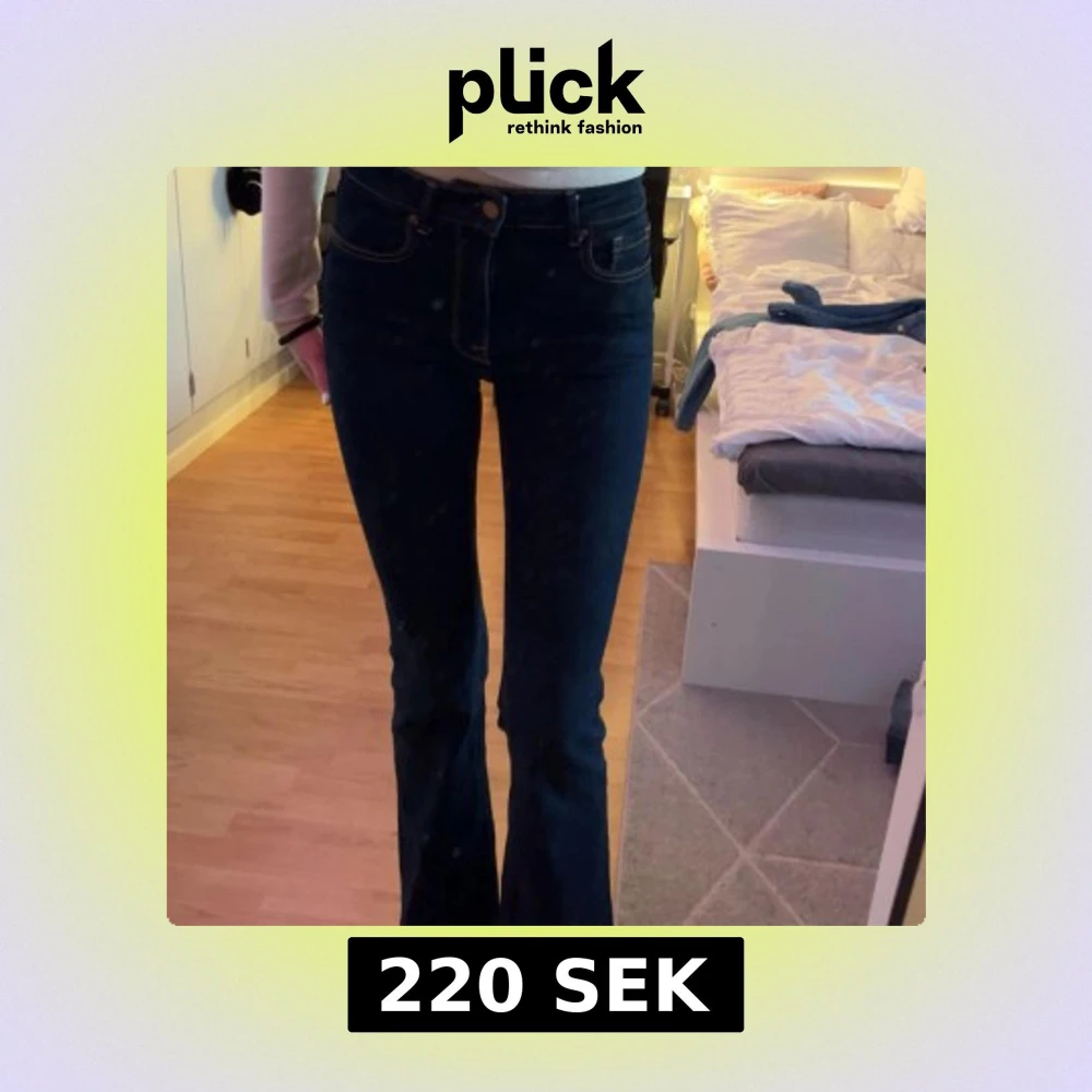 Snygga mörkblå jeans med bootcut-modell och medelhög midja. Klassisk femficksdesign och kontrastsömmar. Använda ett fåtal gånger. 84 i innerbenslängd