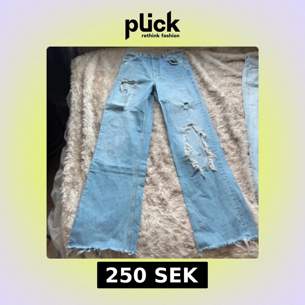 Säljer ett par ljusblå jeans från Zara i storlek 36. Jeansen har breda, raka ben och flera slitningar och hål. Liten fläck på högra knät. innerbenslängd 86 cm.