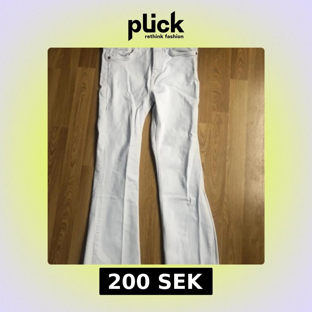 Vita jeans från Zara, modellens namn är okänt men de är lite ”flare” längst nere, även lite trådig look där. Skulle passa någon som är 155-160cm, de är designade för att inte vara helt över skorna när man använder dem🩷De är ganska skrynkliga pga att de ej används på länge & har varit vikta, tvättas såklart alltid innan det säljs! Originalpris ca 380kr