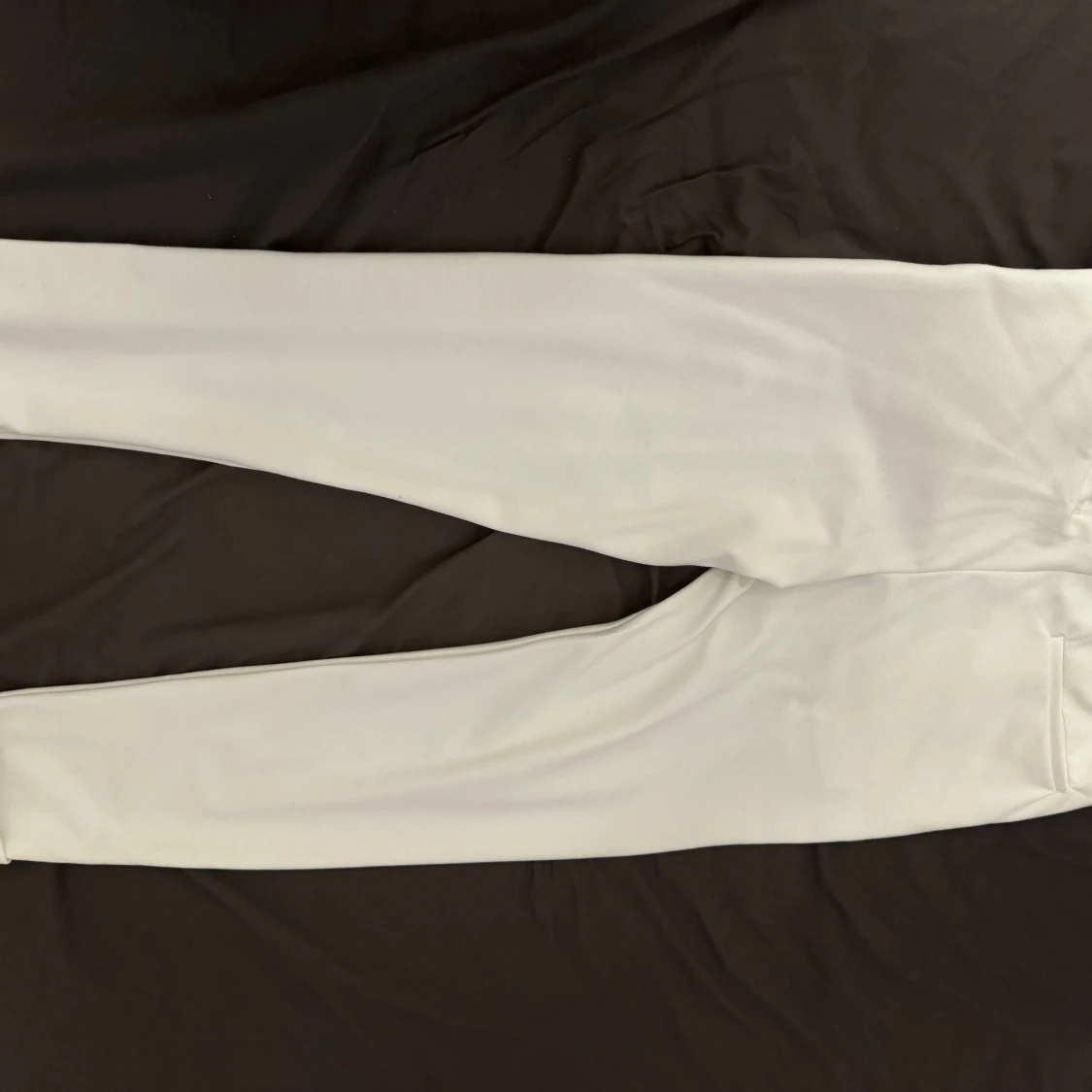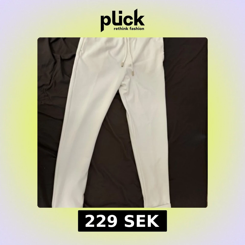 Säljer ett par bekväma vita byxor från Zara med snörning i midjan. Byxorna har en avslappnad passform och är perfekta för en bekväm stil. De har elastiska muddar vid bensluten för en modern look. Inga märken. Inget slitage. Säljes pga att de inte längre passae