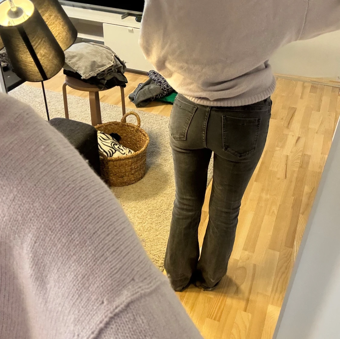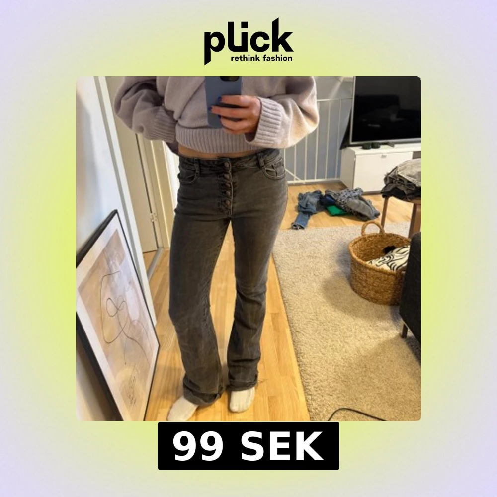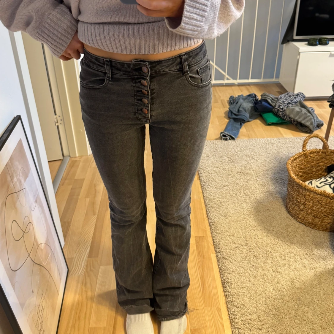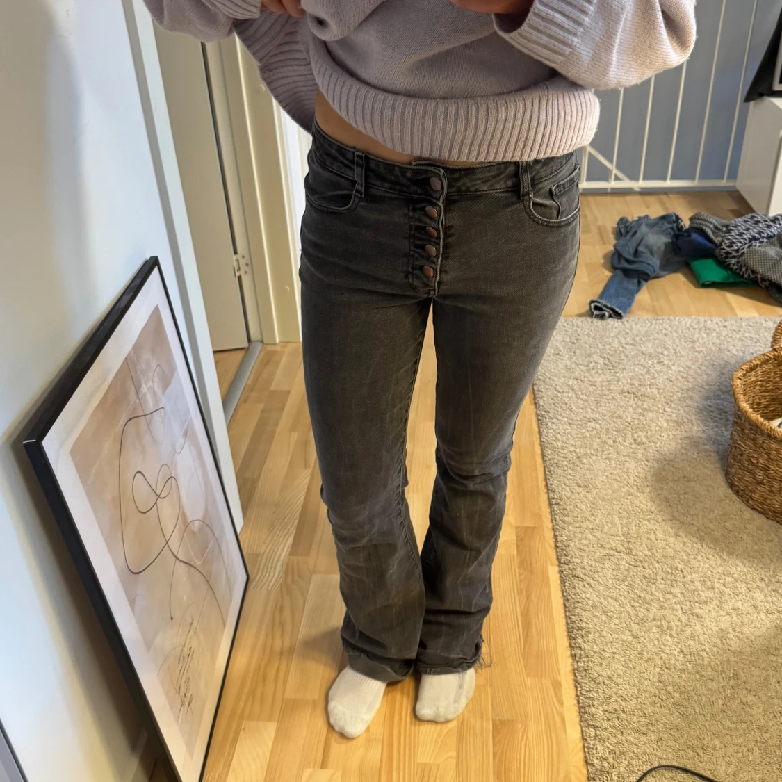 Snygga grå bootcut jeans med hög midja och knappar framtill. Perfekta för en avslappnad stil med en twist. De har en klassisk femficksdesign och en bekväm passform.