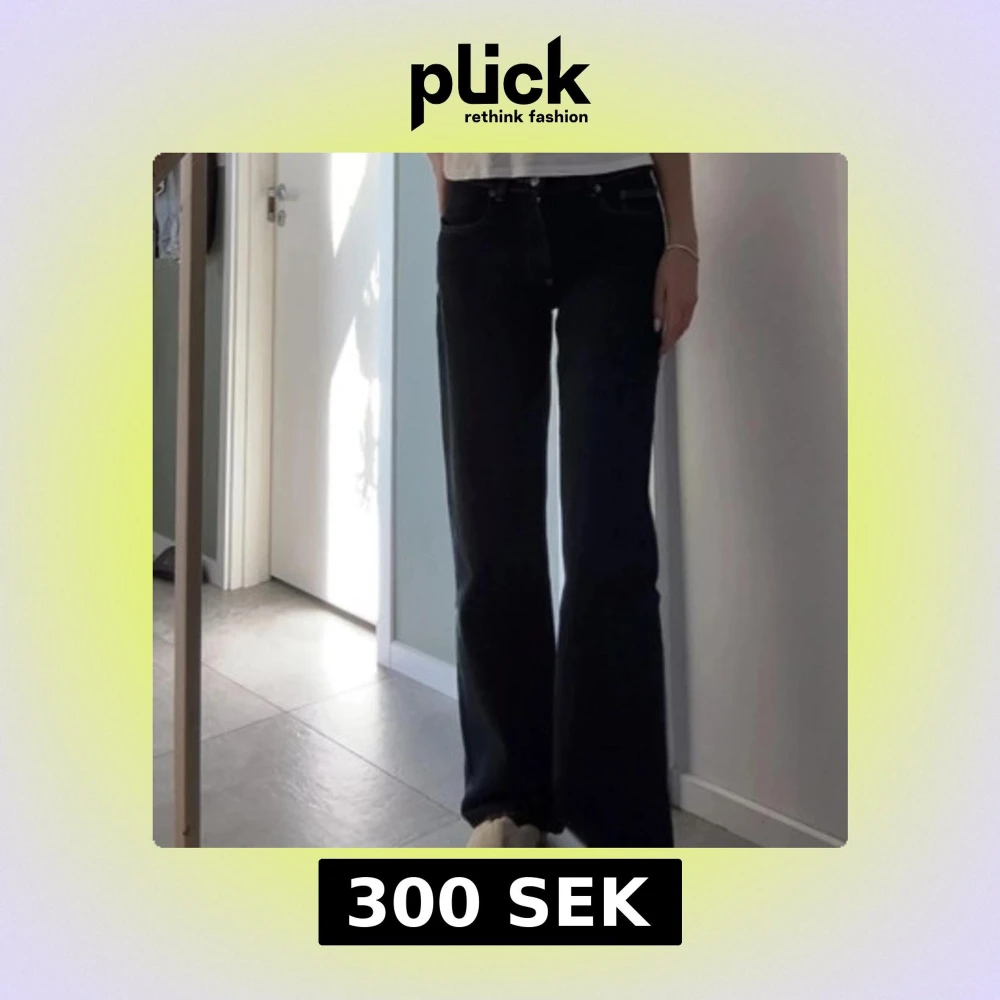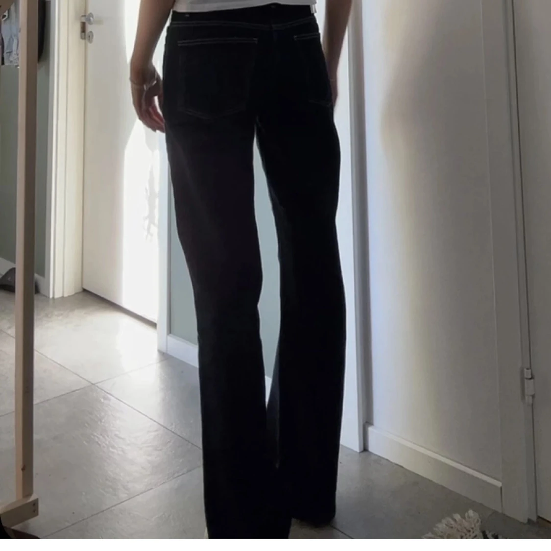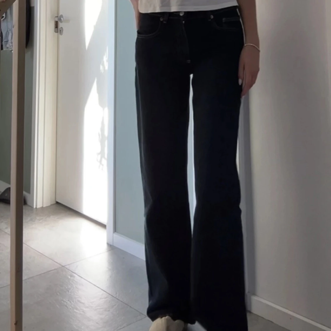 Snygga mörkblå jeans med bootcut passform och vita . Skulle säga medel till låg midja och raka ben som blir vidare nertill. Super snygga men har flera som är liknande💕 i storlek 38 men skulle säga mer som 36 eller liten 38
