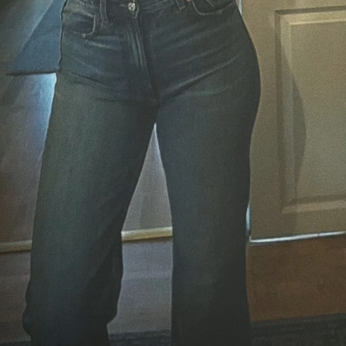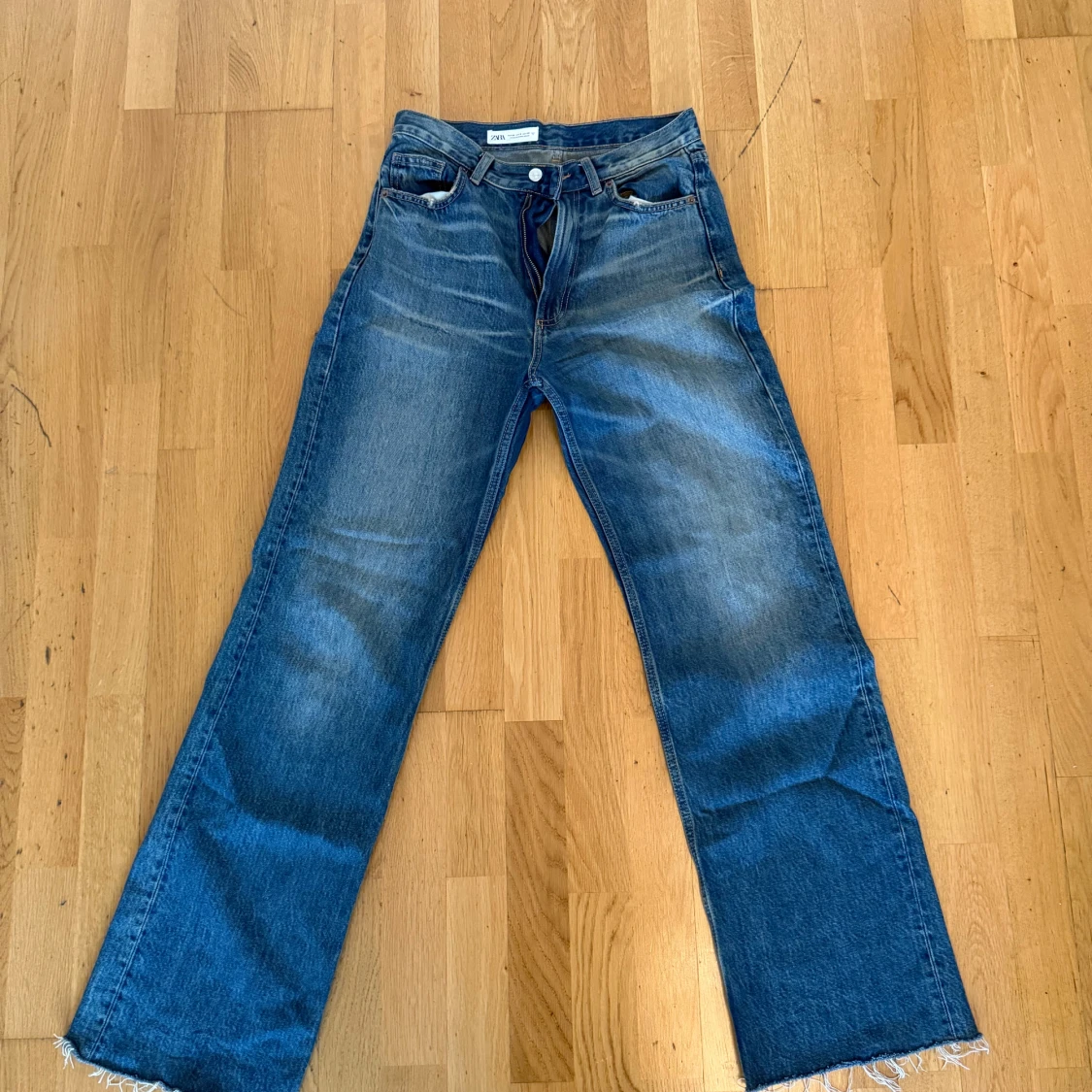 Säljer ett par blå jeans från Zara i rak modell med hög midja. Jeansen har snygg tvätt, råa kanter nertill och klassisk femficksdesign. Perfekta till sneakers eller boots och passar dig som gillar en avslappnad men trendig look.