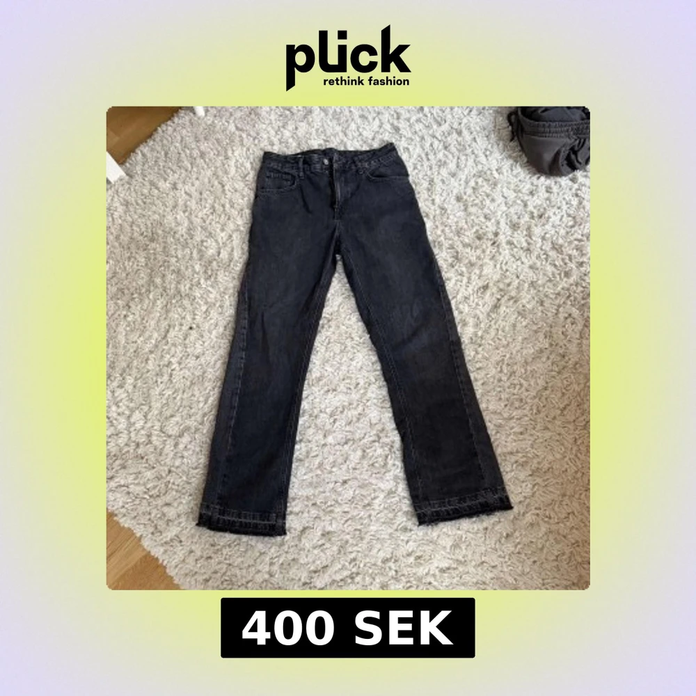 Säljer ett par svarta jeans från Zara i storlek 40. Jeansen har en bootcut passform med normal midja och klassisk femficksdesign. Jeansen är knappt använda och ordinarie priset är 600 kr. Materialet är denim i bomull och de har en enkel, stilren look som funkar till allt.
