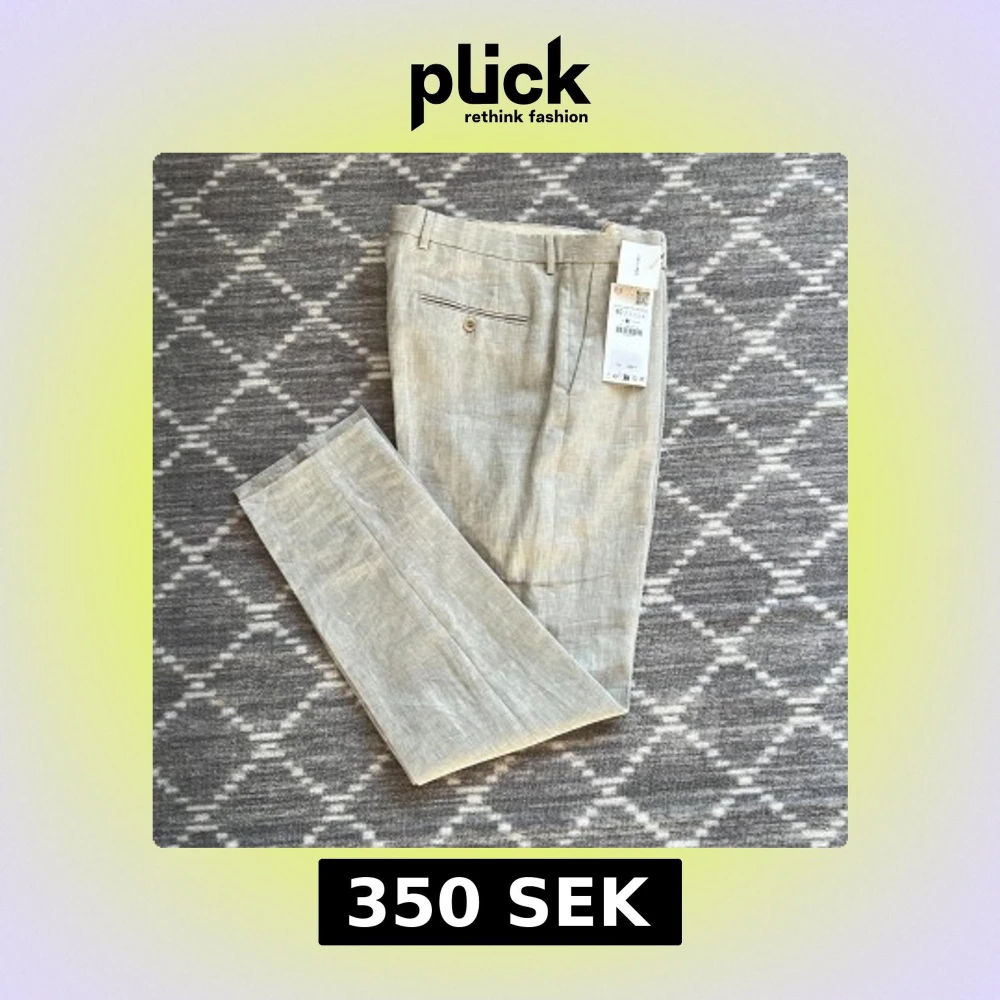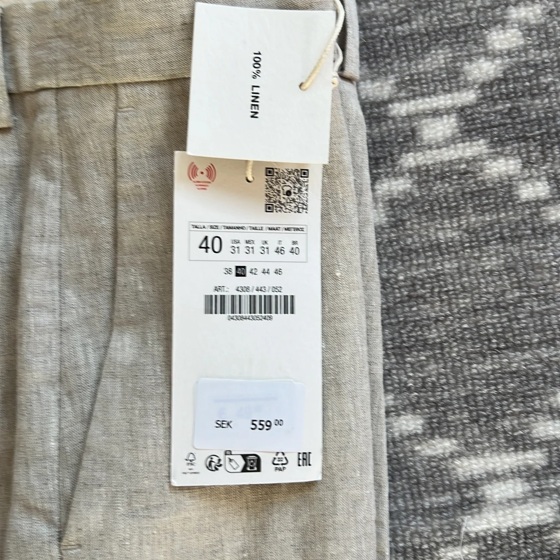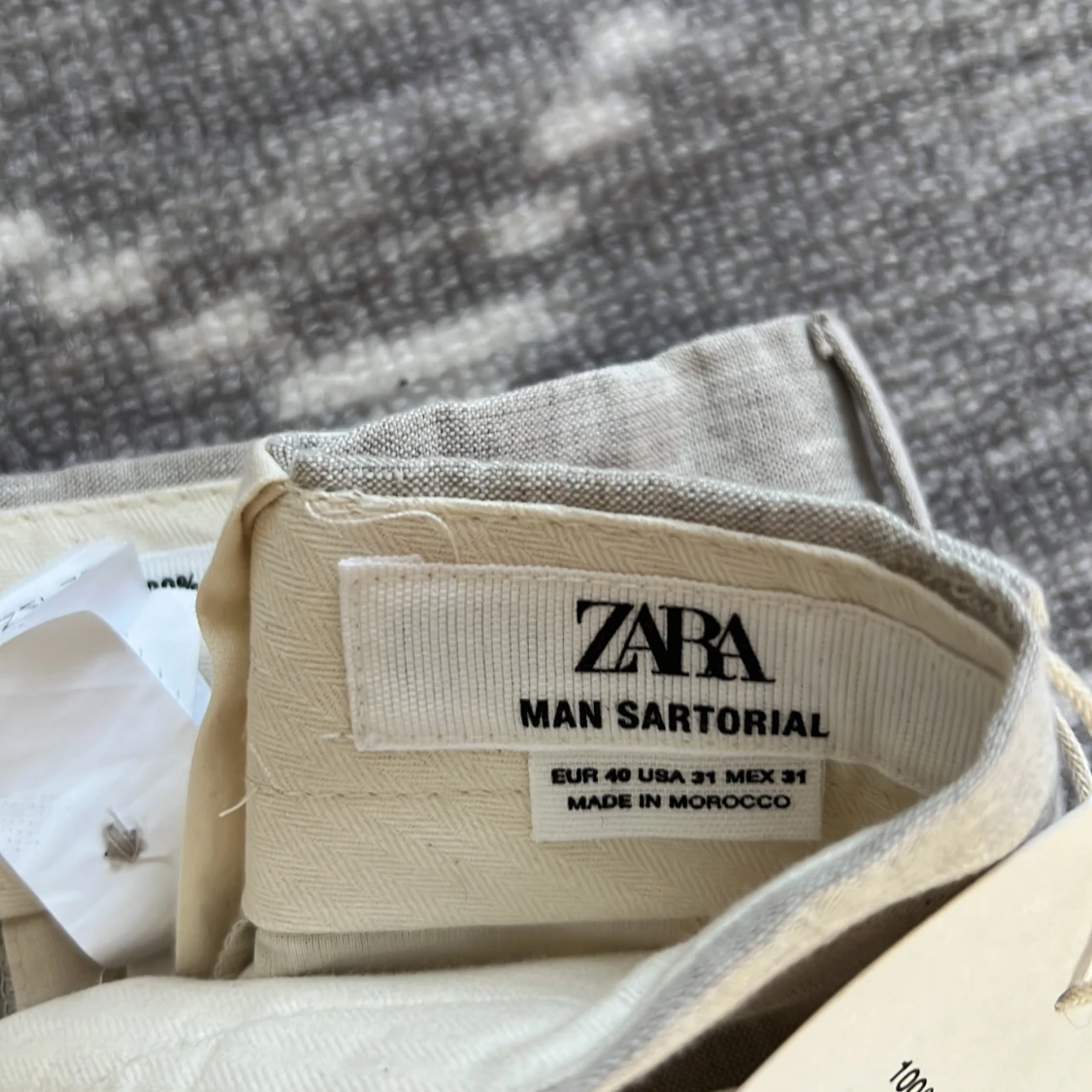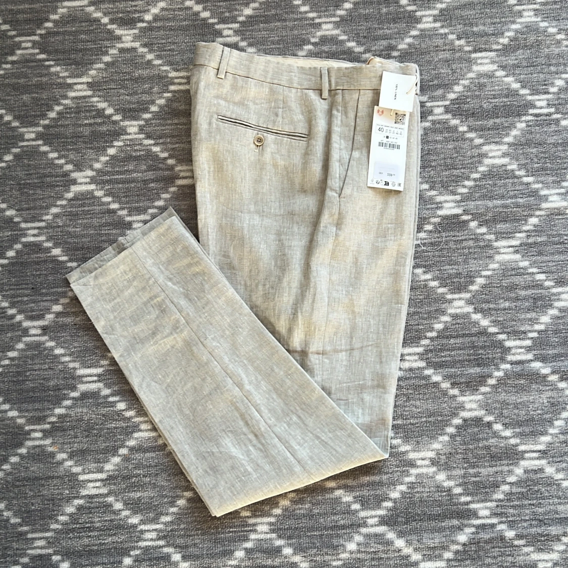 Snygga beige linnebyxor från Zara Man Sartorial i 100% linne. Klassisk rak passform med pressveck, bälteshällor och bakficka med knapp. Perfekta för en stilren och luftig look under varmare dagar.