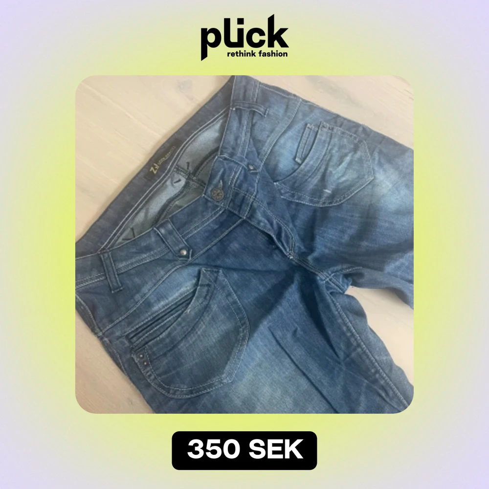 SJUKT SNYGGA LÅGMIDJADE BOOTCUT JEANS!! ☀️💕🫶 Det är snygga detaljer överallt på jeansen, låren har små hål (inte helt igenom), knappen har en liten blomdetalj, fram& bakfickorna är super unika och coola. Står ingen storlek men de passar 44/46 ❤️