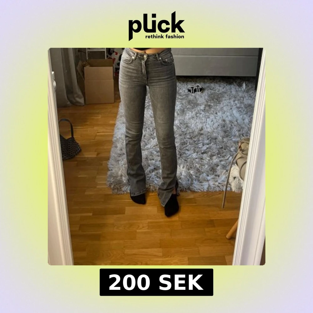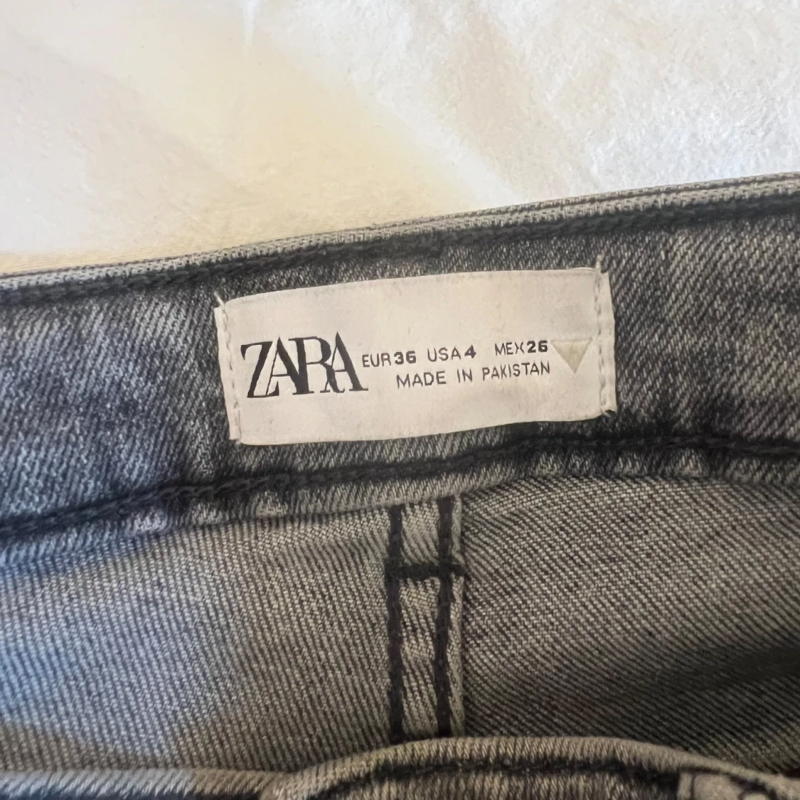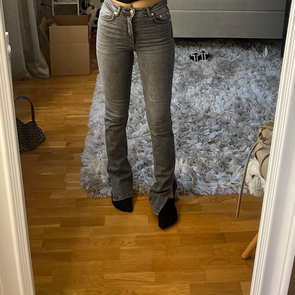 Snygga grå jeans från Zara med bootcut passform och slits längst ner, otroligt sköna.