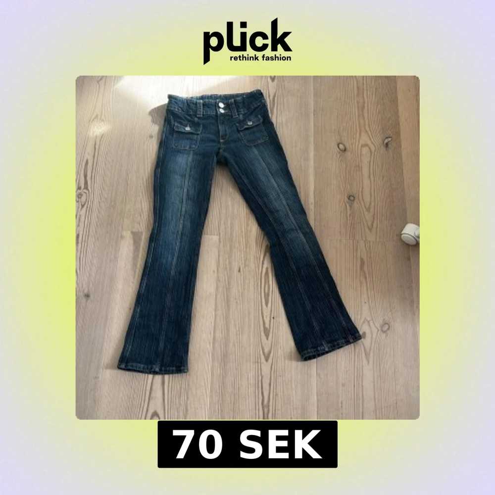 Säljer ett par snygga blå bootcut jeans från H&M. De har låg midja och justerbar midja för perfekt passform. Klassisk femficksdesign med dubbla knappar fram. Perfekta för en avslappnad stil.