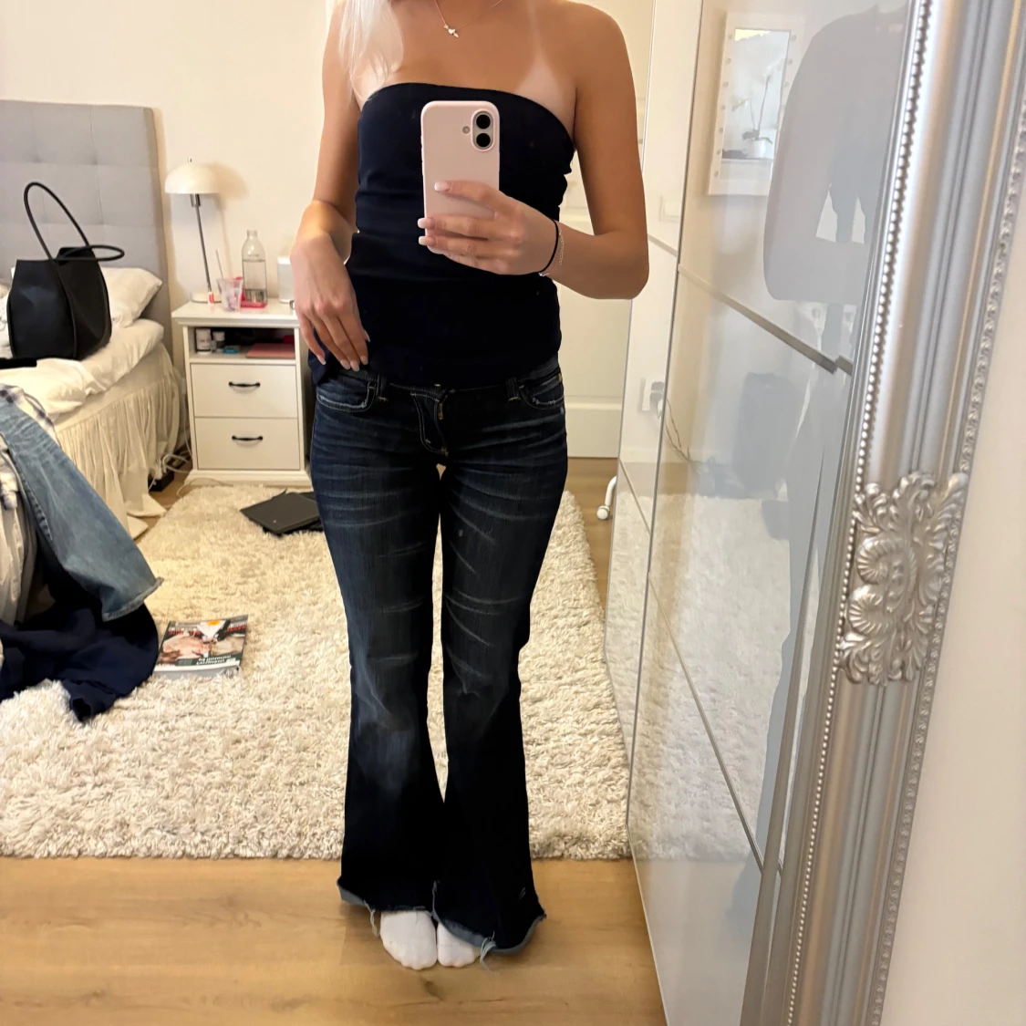 Snygga jeans i storlek 26/32, är avklippta längst ner och passar någon runt 165💕
