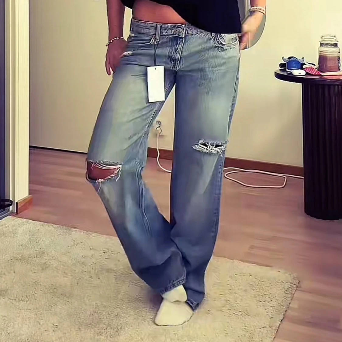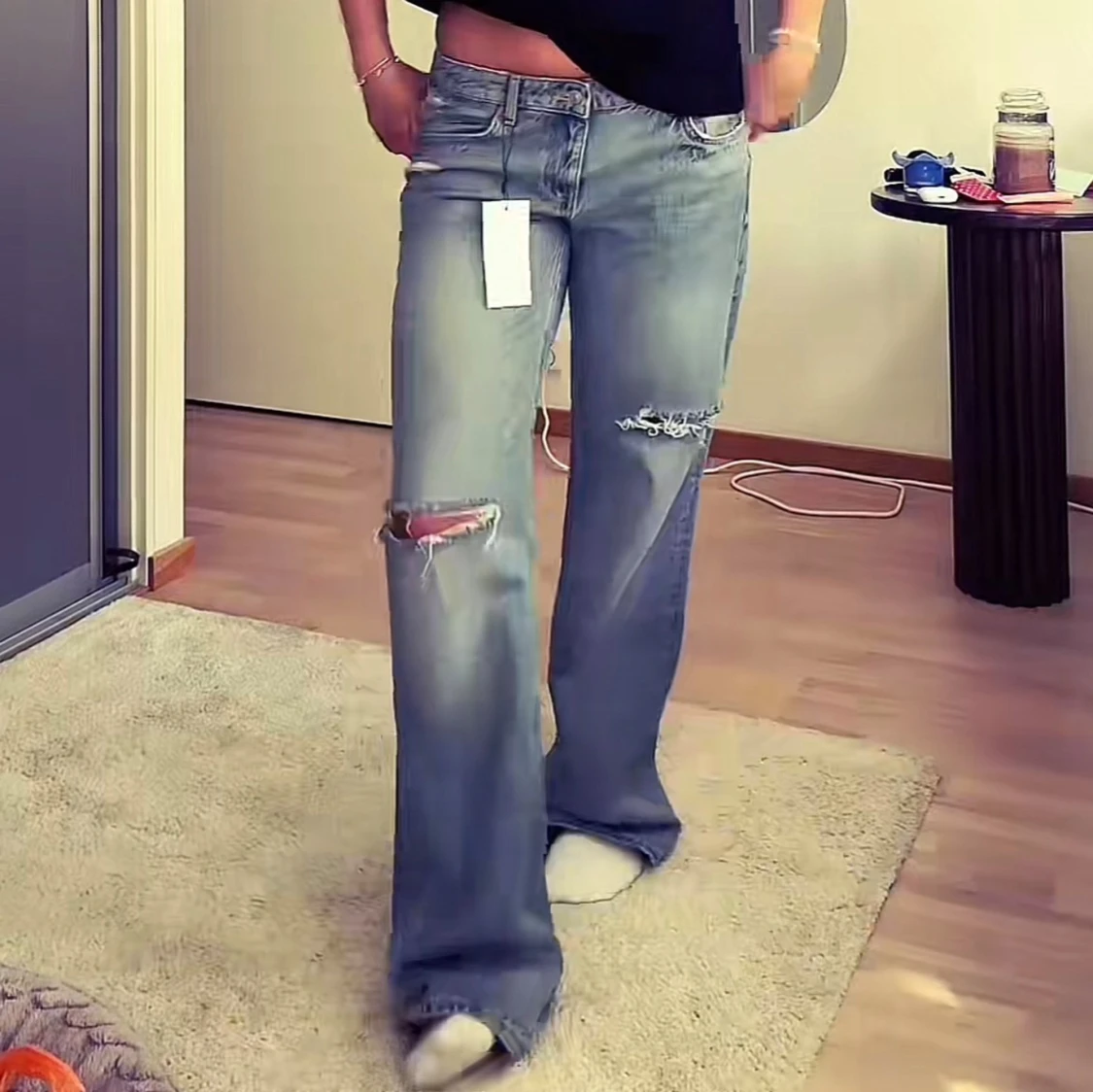 Helt nya och oanvända wide/baggy jeans från zara i strl 34💗💗prislapp finns kvar, hon på bilden har strl 40 och är 168cm lång🌸🌸 Jag behöll strl 36 och säljer nu strl 34 då jag ville ha de mer baggy, jag har vanligtvis 32/34 och xs/s i jeans, är 160 lång💗💗