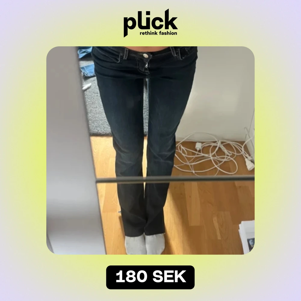 Säljer ett par mörkblåa jeans, där jag sytt på stjärnor på båda fickorna där bak samt en slit längst ner, se sista bilden! Passar mig som är runt 167