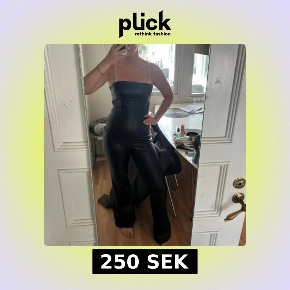 Säljer en svart jumpsuit med smala axelband och figurnära passform upptill.