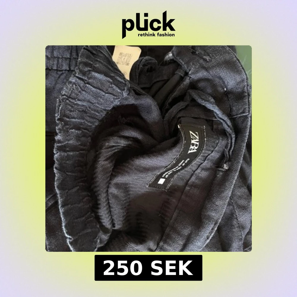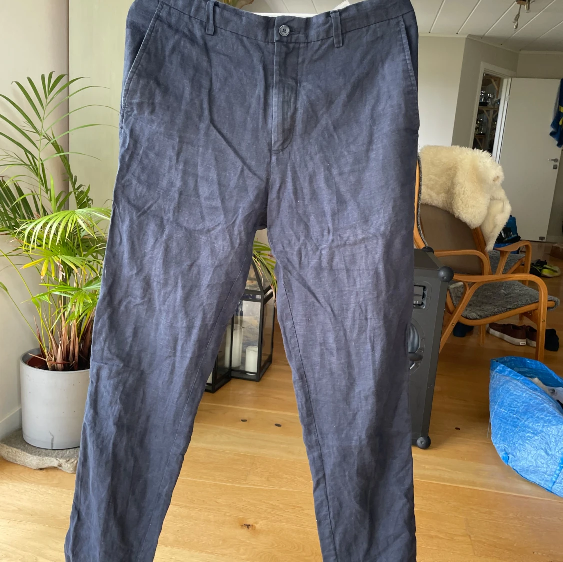 Snygga mörkblå linnebyxor från Zara med elastisk midja bak och klassisk knapp framtill. Byxorna har raka ben och passar till någon som är ca 185 cm. Säljes endast då de är för små åt min pojkväns lillebror❣️❣️